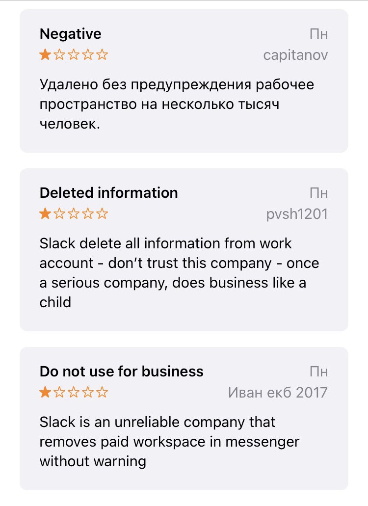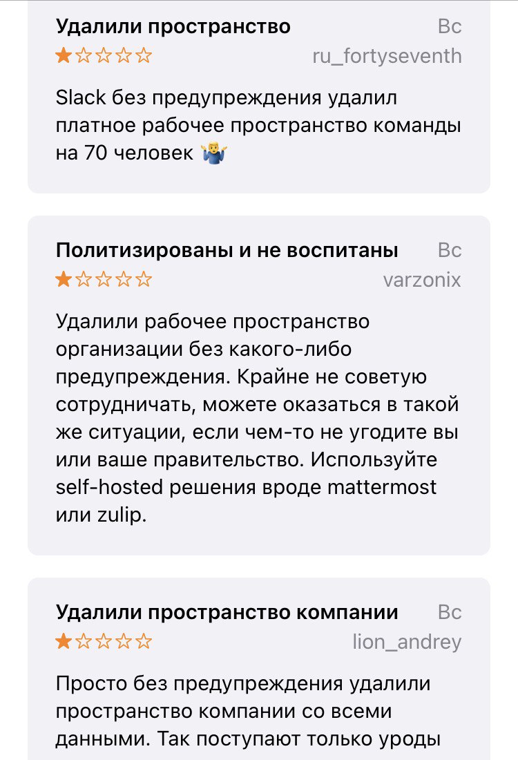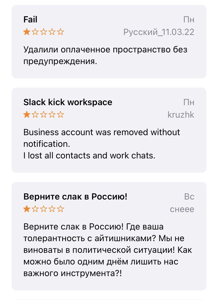 В App Store появились отзывы об удалении рабочих пространств в корпоративном мессенджере Slack у пользователей из России. Внимание на это обратило издание vc.ru. В материале говорится, что такие же сообщения есть и в Google Play. Проанализировав онлайн-магазины, в этом также убедилась «Бумага».