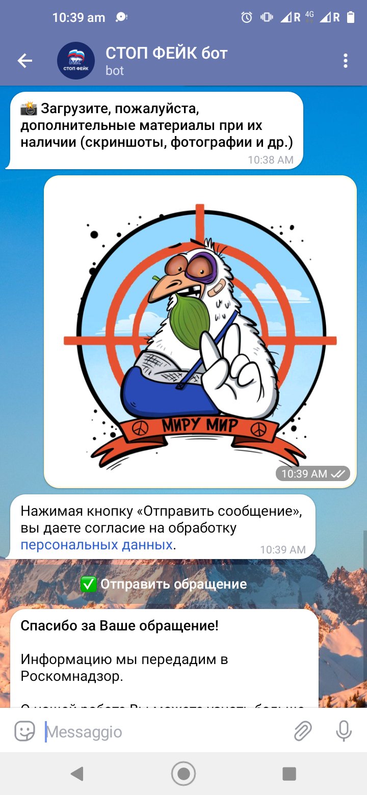 «Бумага» писала, как работает этот бот. При отправке жалоб он предлагает написать обращение, после чего автора просят загрузить скриншоты или фотографии, указав свое имя, фамилию, отчество, а также электронную почту. В «ЕР» объяснили, что необходимость создания онлайн-сервиса вызвана «существенным количеством жалоб на фейковые новости, которые мгновенно расходятся, а их распространение остается безнаказанным», в том числе на новости о действиях российской армии.