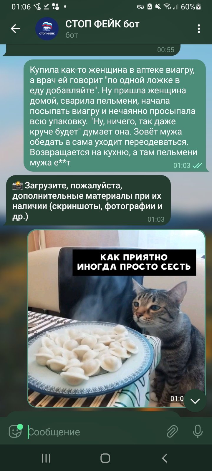 Так, вместо жалоб в бот отправляли картинки с котиками и фразами «Миру — мир», анекдоты про пельмени и парту, мем «Упоротый лис» и другие сообщения. Публикуем скриншоты некоторых из них.