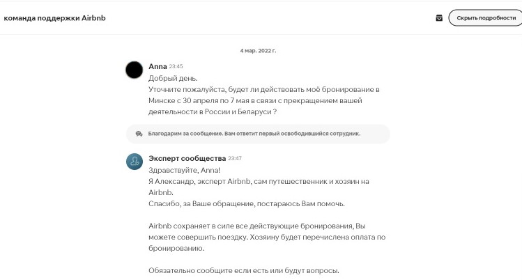 В Airbnb также отметили, что новые ограничения полностью соответствуют заявлению о приостановке работы, сделанному месяц назад. При этом поддержка сервиса в переписке с клиентами утверждала, что бронирования, сделанные до 4 марта, не будут отменены. В распоряжении «Бумаги» есть скриншот такого сообщения.