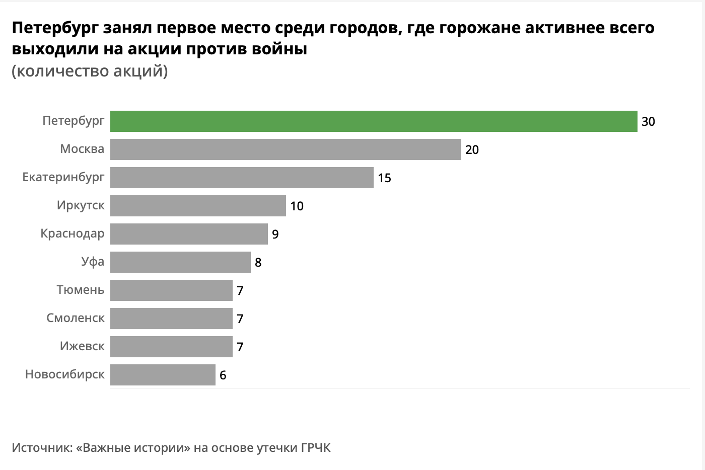 • В Петербурге провели 30 антивоенных акций — это самый большой показатель среди других городов России. Второе место заняла Москва с 20 протестами. Также в список городов попали Екатеринбург, Иркутск, Краснодар, Уфа, Ижевск, Смоленск, Тюмень и Новосибирск.