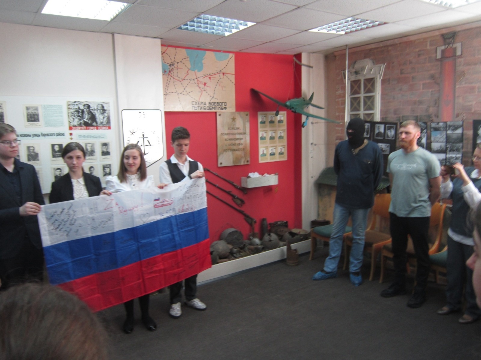 О чем именно разговаривали школьники с гостями, не уточняется. Музею гимназии передали флаг, на котором расписались участники отряда спецназначения.