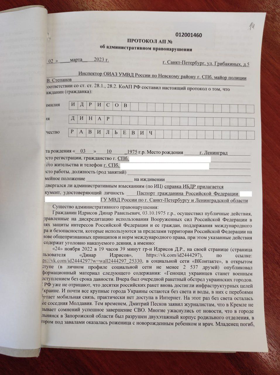 На правозащитника Динара Идрисова составили протокол о «дискредитации» армии (статья 20.3.3 КоАП) из-за его публикаций во «ВКонтакте». Во вторник, 18 апреля, в Невском районном суде Петербурга прошло заседание по делу Идрисова. Об этом правозащитник сообщил в своем телеграм-канале.