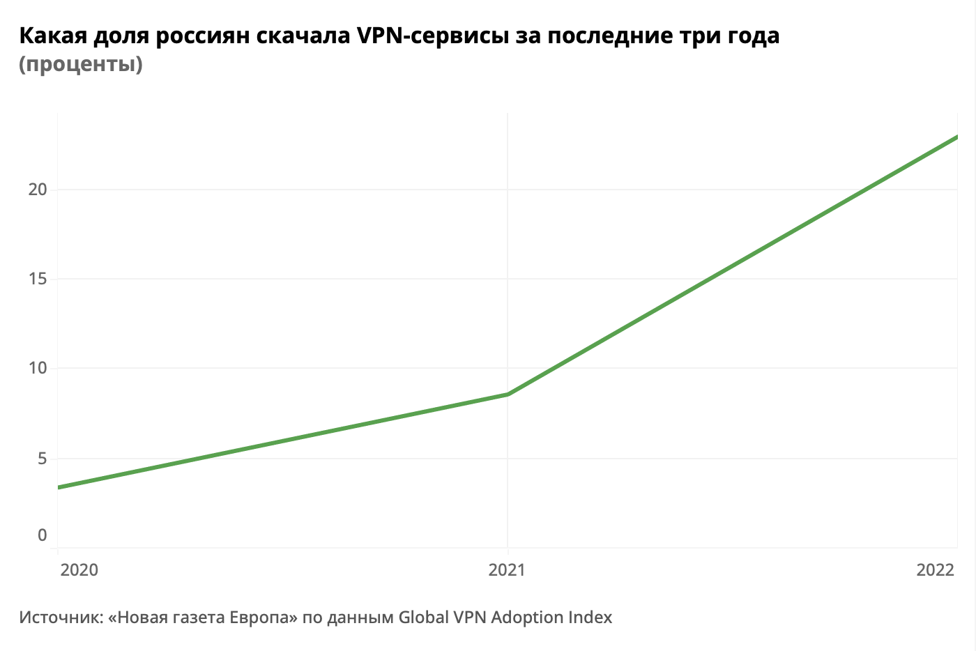 - В 2022 году 23 % россиян установили VPN. Для сравнения: в 2020-м сервисы скачали только 3,4 % населения, в 2021-м — 8,6 %.