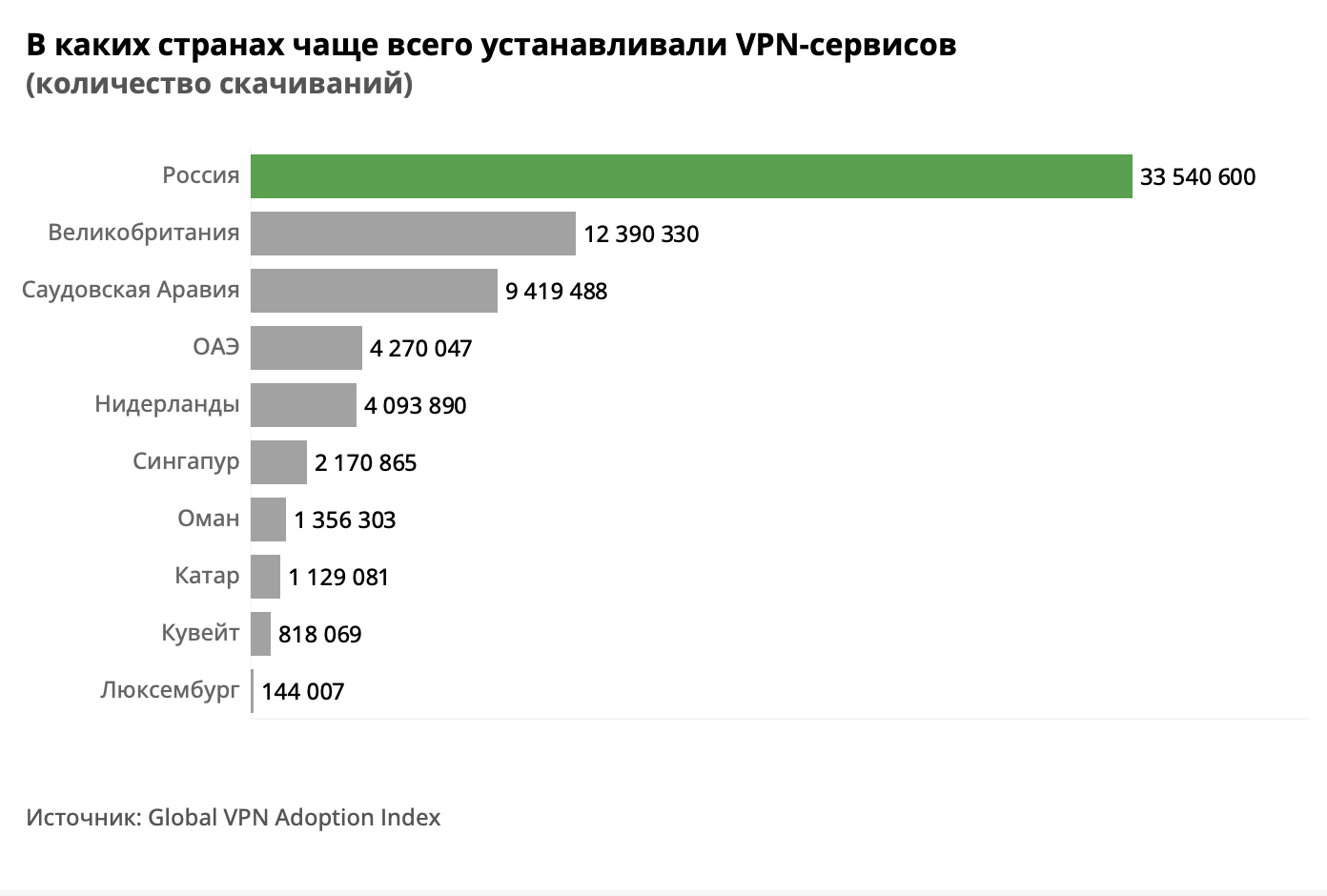 В 2022 году Россия попала в десятку стран по темпам скачивания VPN-сервисов. На соответствующие данные сервиса Global VPN Adoption Index обратила внимание «Новая газета. Европа».