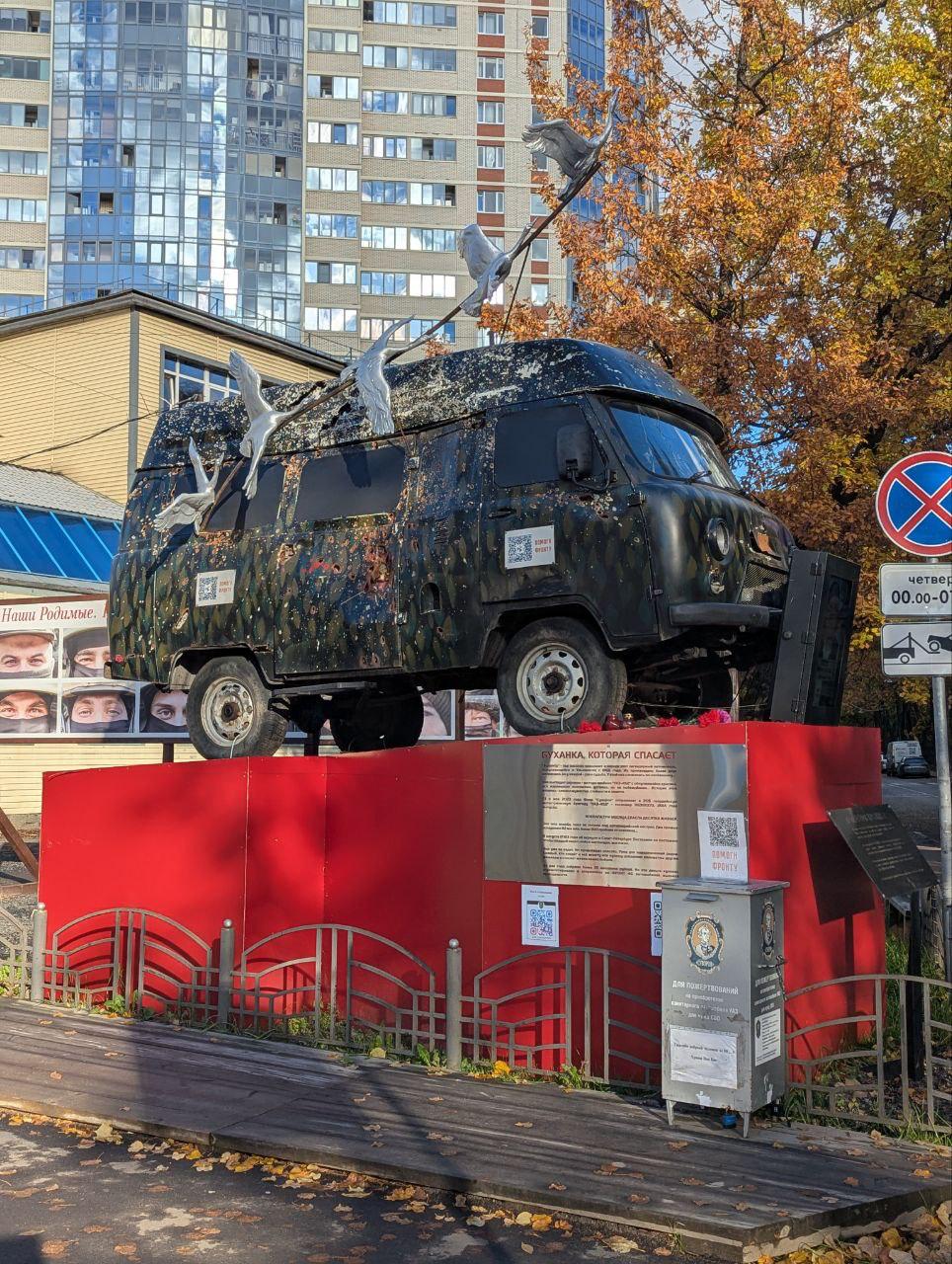 Что за «буханка». Изрешеченный пулями УАЗ с буквой Z оставили рядом с клубом офицеров на улице Александра Матросова в ноябре 2023 года. Позже у автомобиля начали размещать бумажные портреты погибших военных, а в сентябре этого года лица солдат начал показывать установленный рядом с «буханкой» экран.