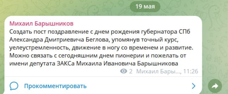 Детали. Депутат Закса от «Единой России» Михаил Барышников в день рождения Александра Беглова разместил в своем канале пост с инструкцией о том, что нужно написать в поздравительном посте. В частности, он предложил связать событие с Днем пионерии.
