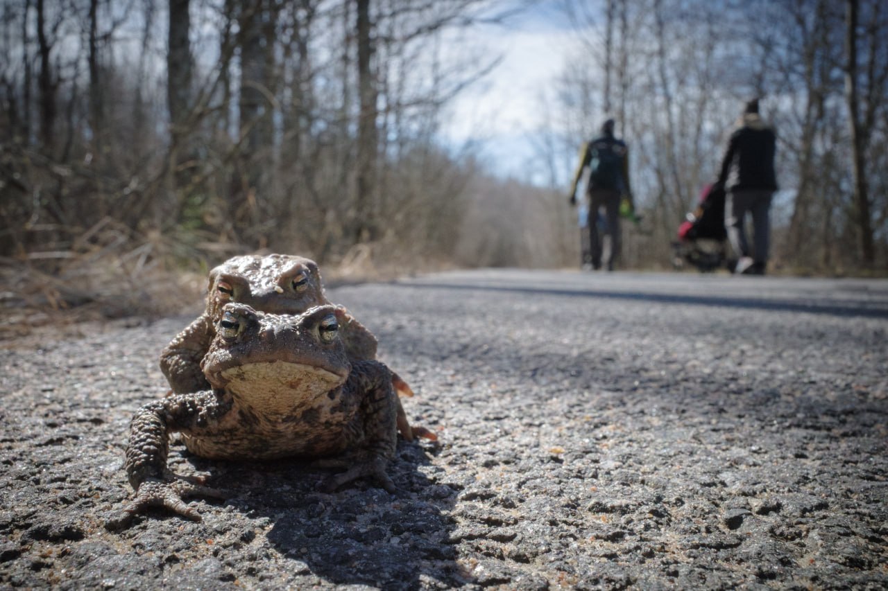 Весной жабы отправляются из лесов к берегу на нерест. Их путь проходит через проезжую часть. Люди помогают им перебраться через дорогу, а также подсчитывают земноводных.