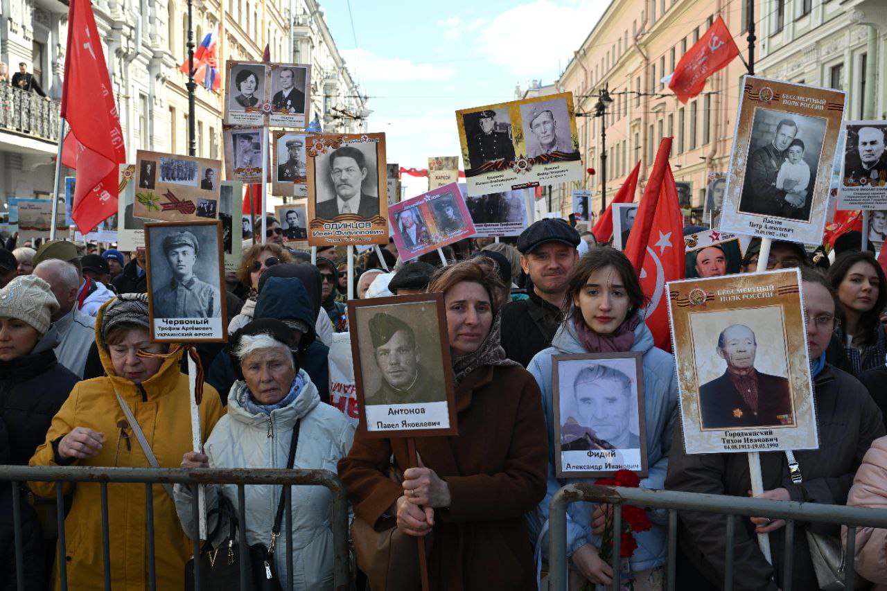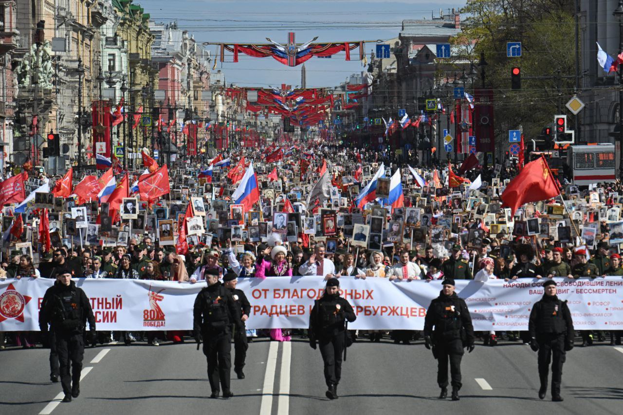 Корреспонденты «Бумаги» прошли в колонне «Бессмертного полка». Шествие продолжалось два часа. По оценке администрации Петербурга, в нем участвовали 1,1 миллиона человек — «рекордное число» в юбилейный год 80-летия победы. Прошлая акция, 2022 года, по официальной информации, собрала миллион участников. То же самое власти говорили про «Бессмертный полк» 2019 года.
