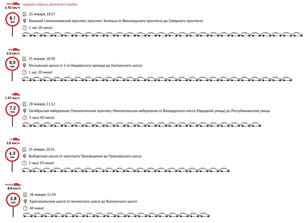Очередь из автомобилей длиной в восемь километров, движение со скоростью ходьбы, дорожный затор на три с половиной часа — «Бумага» составила рейтинг самых длинных и долгих пробок, в которых горожане стояли в январе.