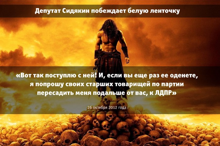 Депутат-единоросс Александр Сидякин на глазах у коллег из Госдумы публично растоптал символ протестного движения — белую ленту, сообщает ИТАР-ТАСС. По мнению Сидякина, белая лента — «это символ капитуляции, символ предательства, экспортной революции, которую нам пытаются навязать иностранные политтехнологии».