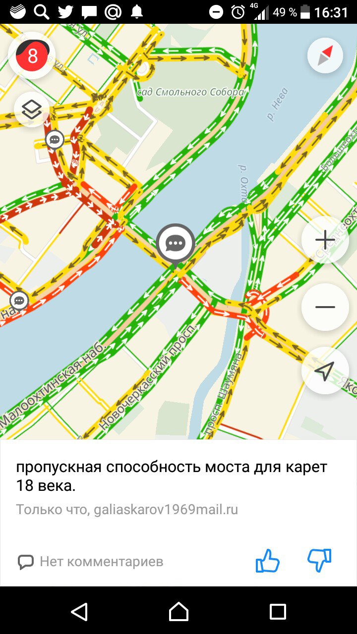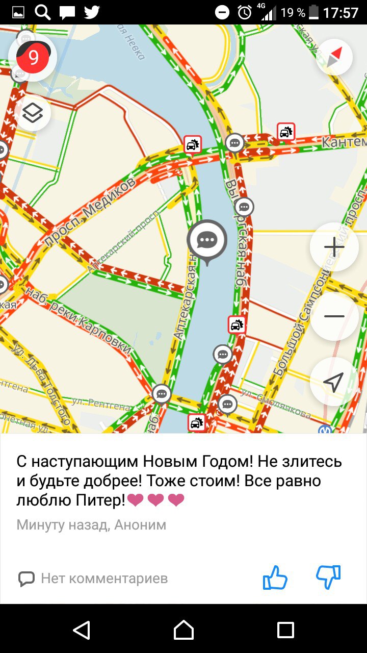 В пятницу, 8 декабря, из-за снегопада и метели на дорогах в центре Петербурга образовались сильные пробки. Они растянулись на 7–9 километров. Судя по данным сервиса «Яндекс.Пробки», некоторые из них достигали 9 баллов.