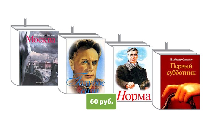 По 60 рублей представлены книги Владимира Сорокина — «Норма», «Голубое сало», «Москва», «Первый субботник». Собрание сочинений в трех томах автора обойдется в 250 рублей.