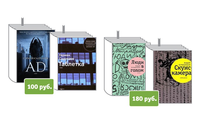 Бестселлеры филолога Андрея Аствацатурова — «Люди в голом» и «Скунс-камера» — по 180 рублей. «Таблетка» и «AD» Германа Садулаева — по 100 рублей.