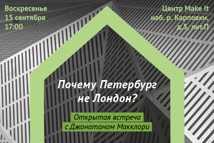 15 сентября интернет-газета «Бумага» проведет открытую встречу с консультантом по региональному брендингу Джонатаном Макклори (Jonathan MacClory), петербургскими архитекторами, урбанистами и гражданскими активистами.