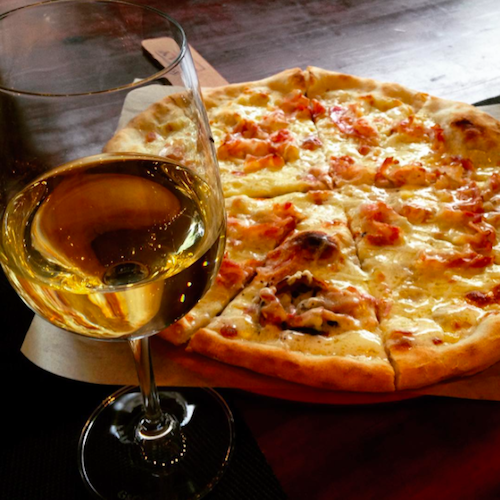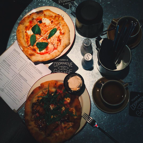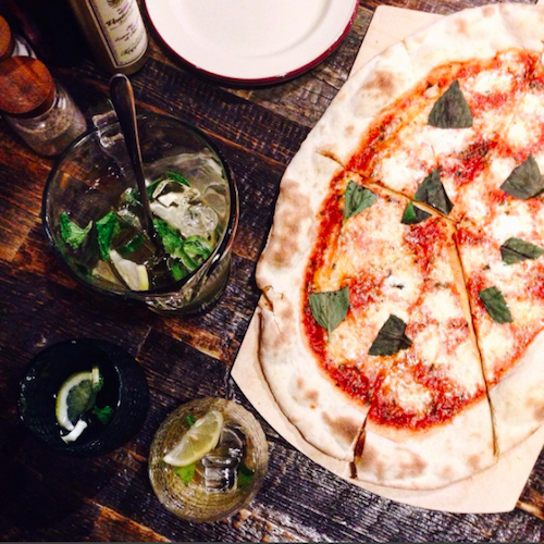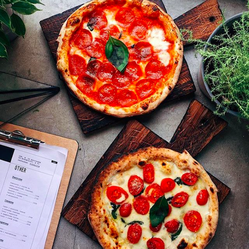 В заведении готовят пиццы, диаметр которых предсказуемо составляет 22 сантиметра. Их выпекают в дворовой печи в центре зала. Из начинок: утка конфи, карамелизированная тыква, поркетта, а также более традиционные ингредиенты.