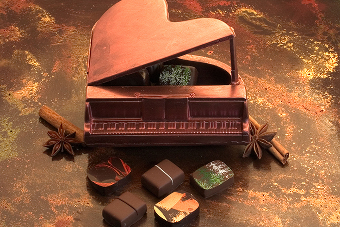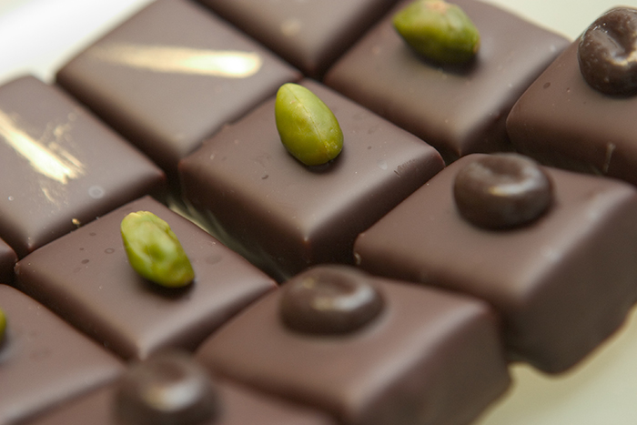 Конфеты бывают формовыми и плоскими. Обычно в формочку заливают шоколад и оставляют немного свободного места. Внутрь кладут начинку — у нас это может быть, например, черная смородина с водкой, малина с гибискусом, вишневое или банановое желе. Сверху все покрывают тонким слоем шоколада и замораживают.