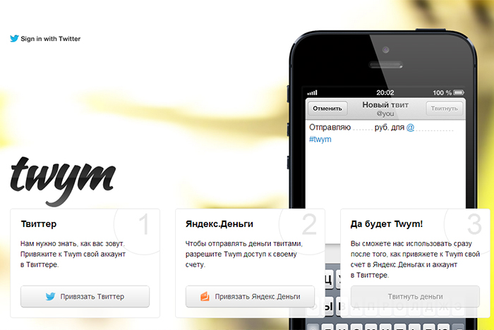 Команда сервиса «Яндекс.Деньги» разработала новый сервис, который позволяет перевести деньги с одного электронного кошелька на другой с помощью простого твита. Сегодня на конференции i-Comference прошла презентация нового онлайн-сервиса Twym. Он работает, используя возможности Twitter и «Яндекс.Денег». С помощью сервиса пользователи могут переводить деньги друг другу с помощью платежных твитов внутри соцсети. Для этого нужно, чтобы оба пользователя имели электронные кошельки в «Яндекс.Деньгах» и аккаунт в Twitter: на сайте приложения twym.ru нужно связать два аккаунта между собой. Для того чтобы деньги перешли из одного виртуального кошелька в другой, достаточно указать ник получателя, сумму и хэштег #twym. Более того, переведенные средства можно вывести на банковскую карту или получить наличными. Эта услуга действует и в России, и в других странах мира. Разработчики утверждают, что новый сервис особенно удобен, если речь идет о сборе средств на благотворительные нужды или об организации совместного проекта с друзьями. До сих пор аналогов Twym в российском интернете не было. У «Яндекс.Денег» уже есть официальные приложения для сбора пожертвований для социальных сетей «ВКонтакте» и Facebook. Но аналогичных проектов для Twitter пока не было. В пресс-службе уточняют, что разработкой сервиса команда сотрудников «Яндекс.Денег» занималась в свободное от работы время.