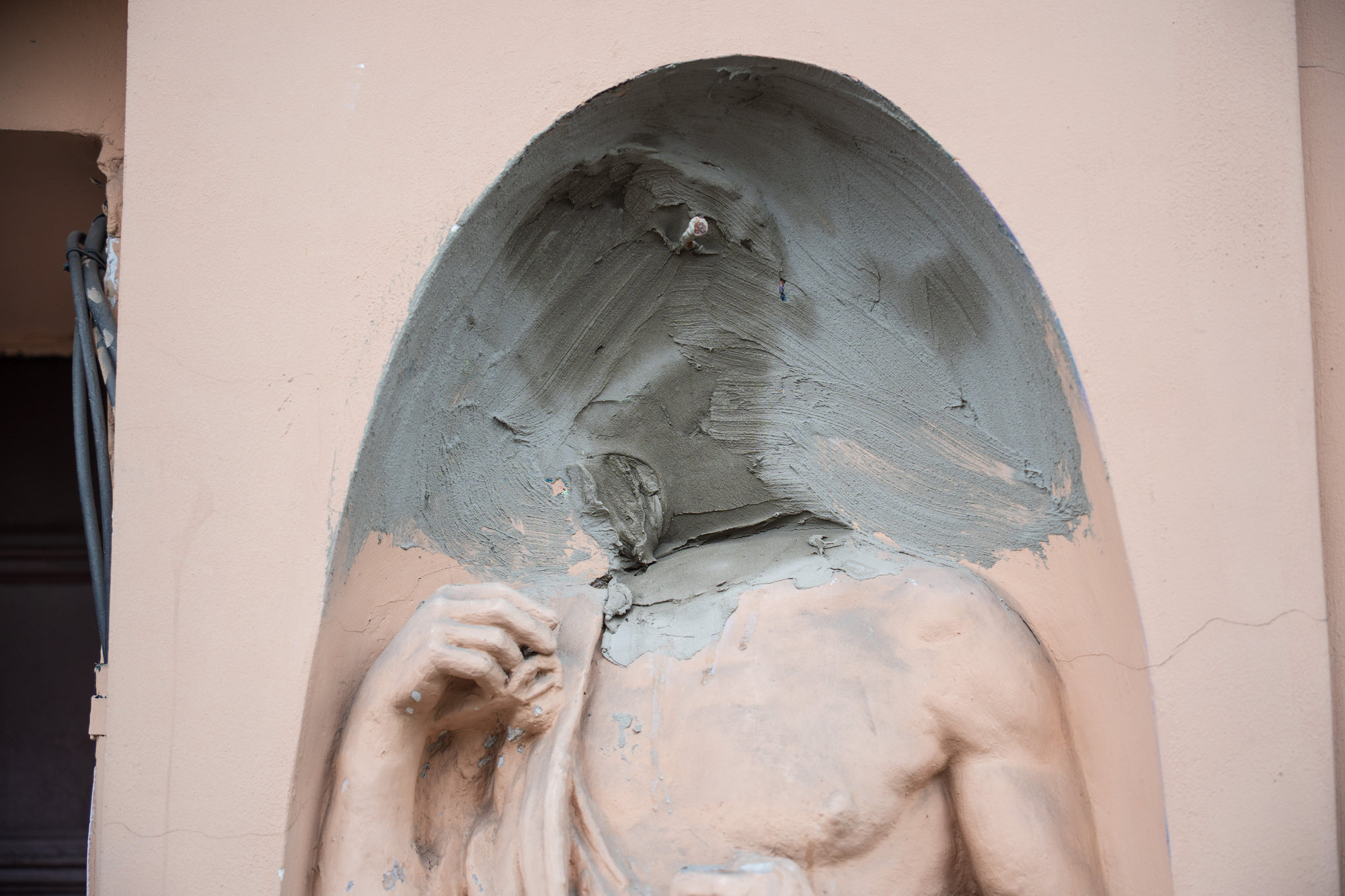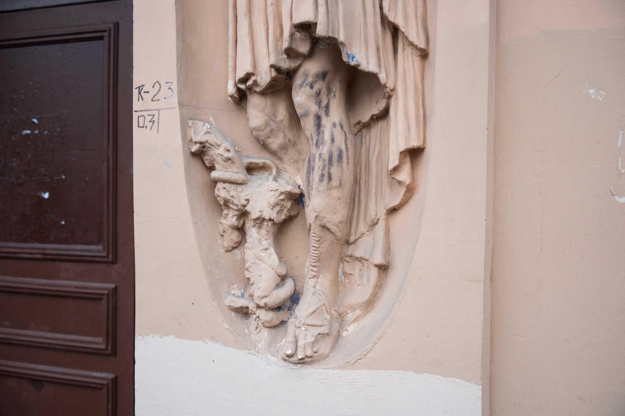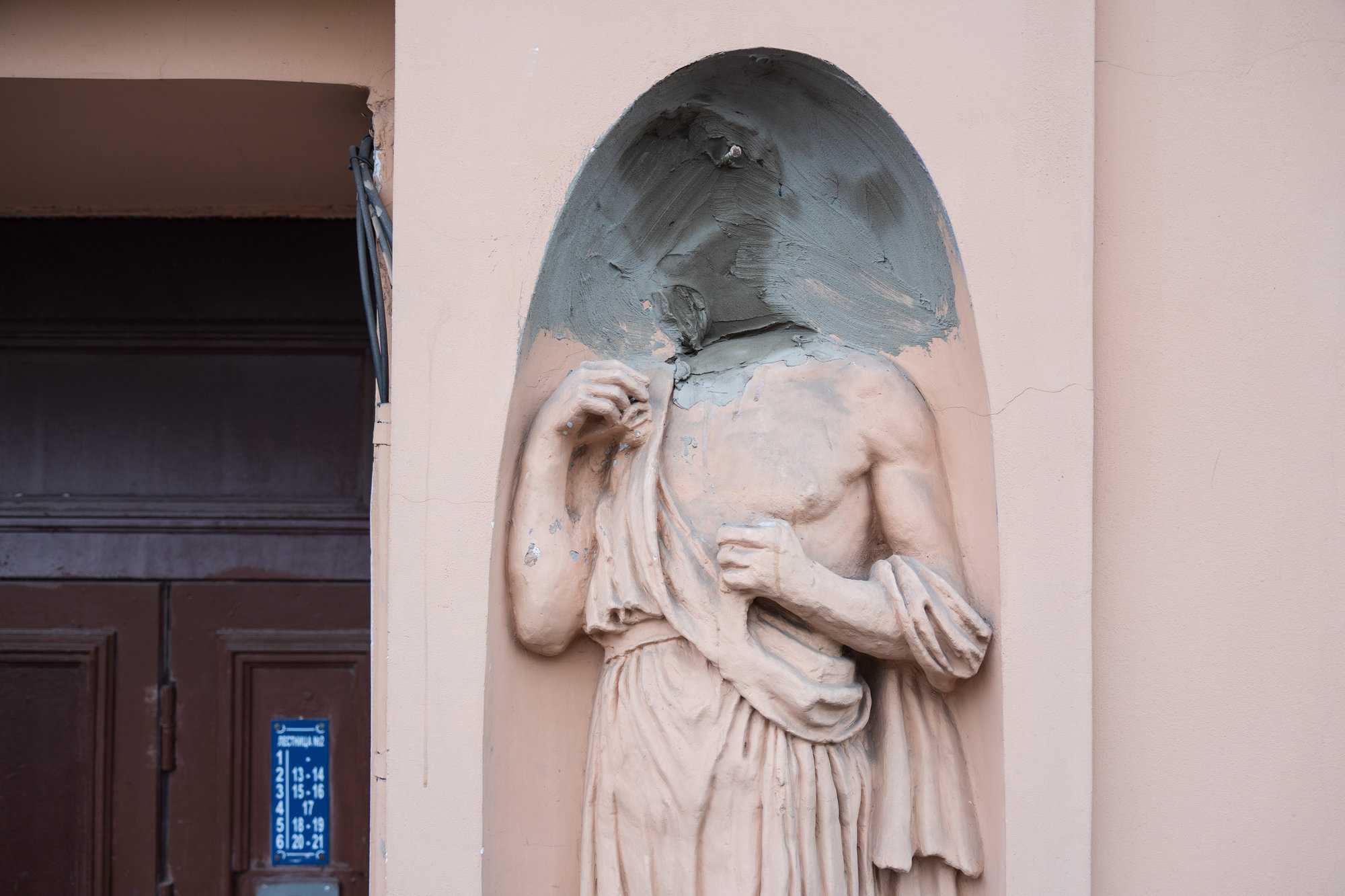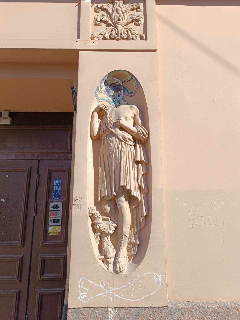 Статуя Диониса на фасаде дома 3 на Большой Пушкарской улице стоит без головы почти 8 лет. Комитет по охране памятников пока не собирается ее реставрировать.