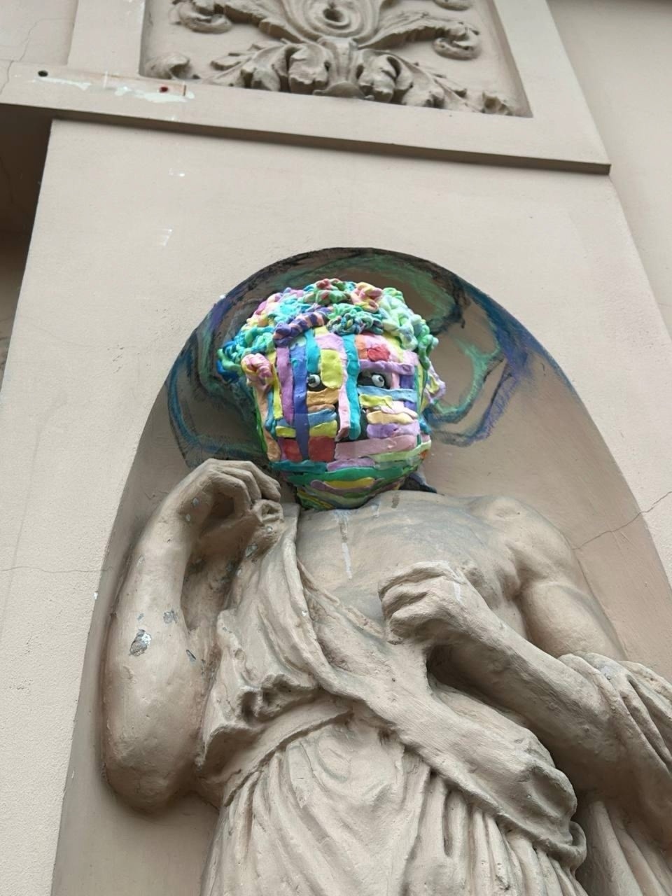 9 июня 2025 год уличный неизвестный художник соорудил статуе новую голову — из разноцветного материала, похожего на пластилин.