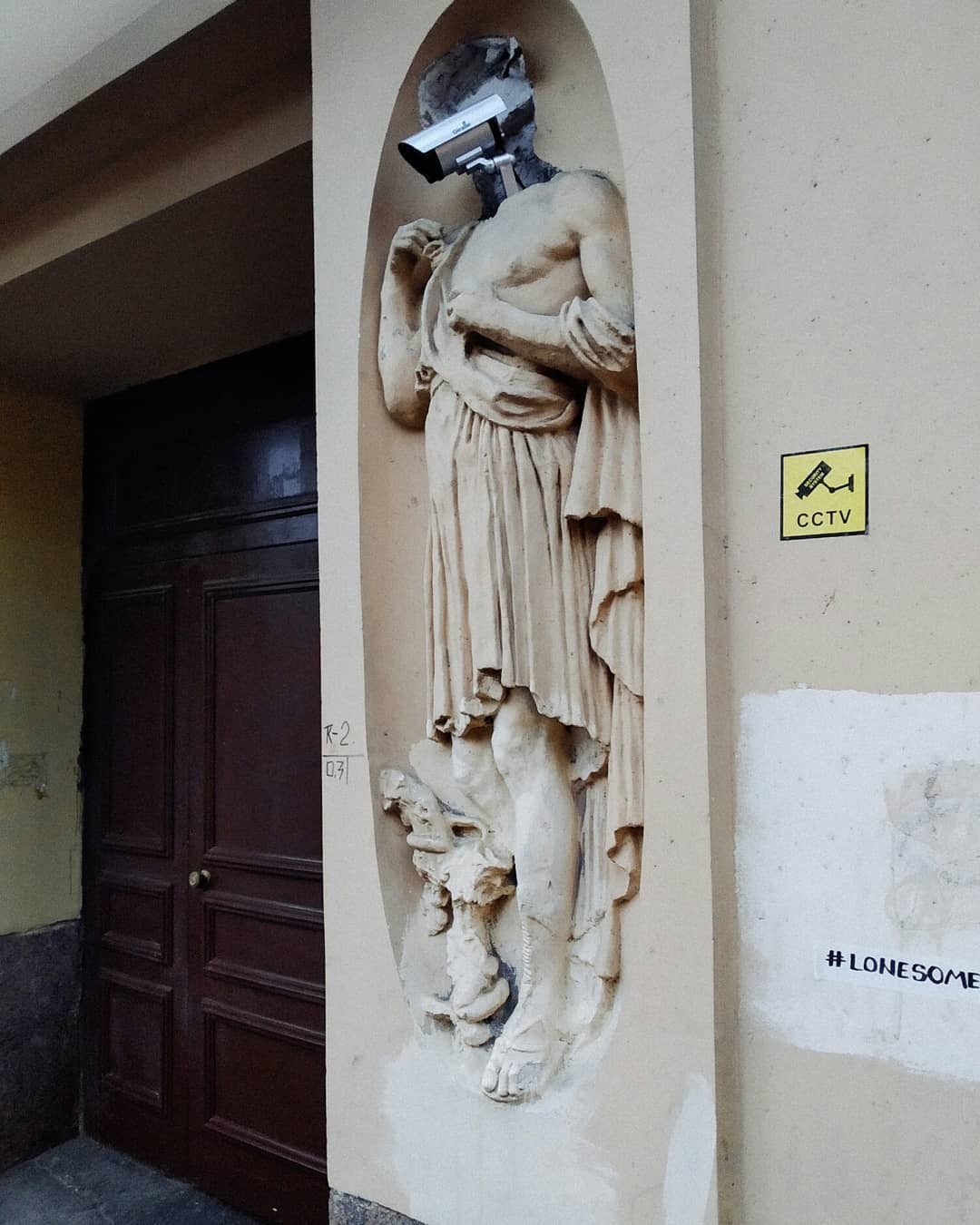 В 2019 году уличный художник под псевдонимом lonesome_grass установил на статуе CCTV-камеру и назвал свою работу «Пугало». Он посвятил ее протесту против «тотальной слежки» за людьми: по мнению художника, такие способы защиты граждан «призваны внушать уважение и страх, но, как и огородное пугало, способны только пугать птиц».