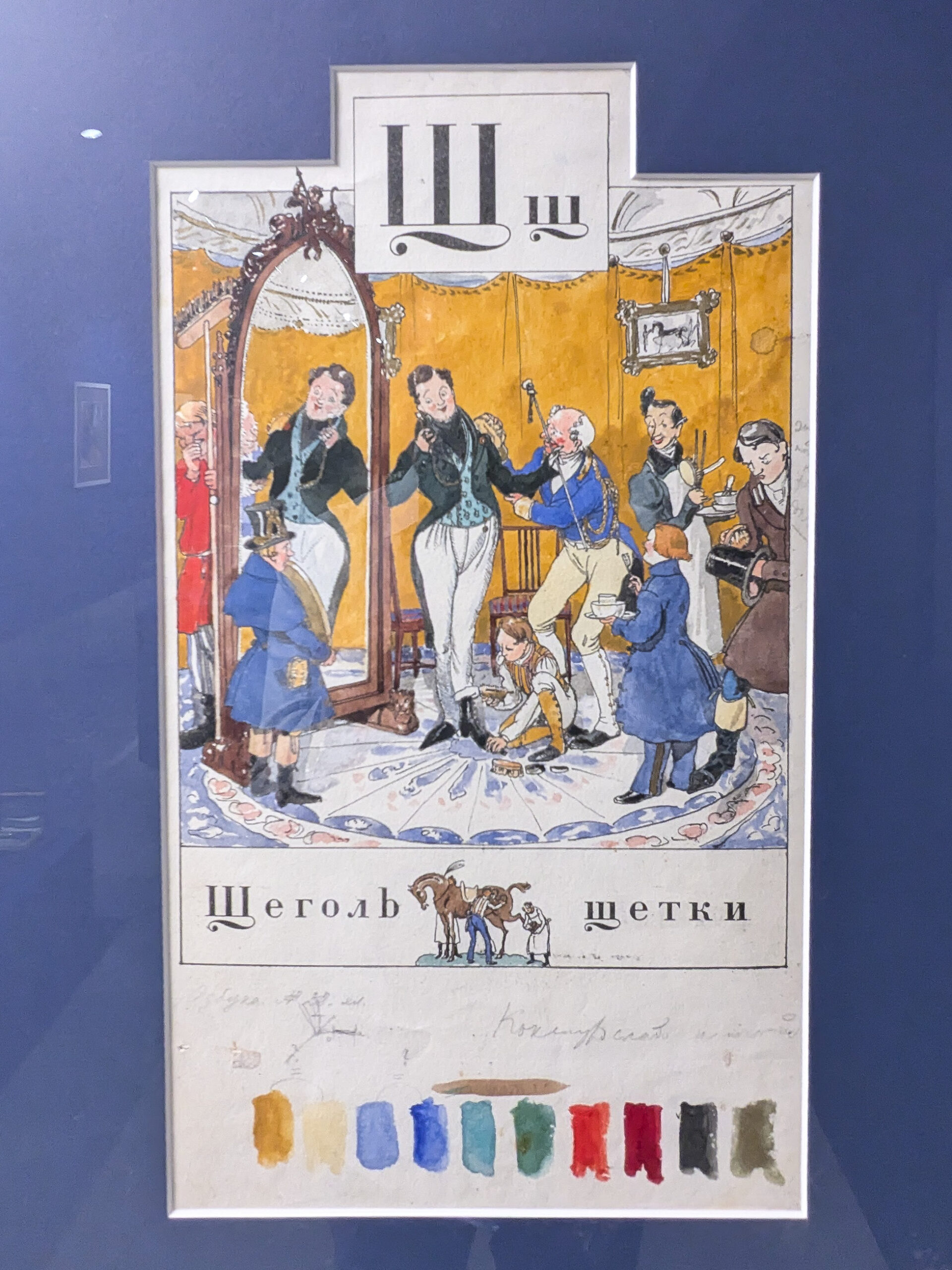 Экспозиция на первом этаже выстроена вокруг «Азбуки» Александра Бенуа