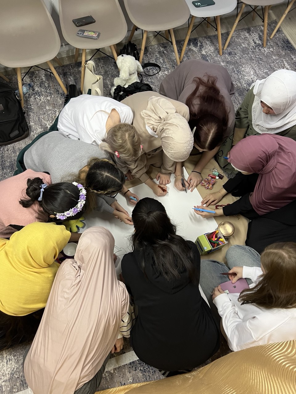 1 февраля был всемирный день хиджаба — это такой день солидарности женщин-мусульманок, которые носят платки и практикуют это в немусульманских странах. Мы с девочками тоже собирались и обсуждали эту тему, но они попросили эту встречу провести без мальчиков, чтобы прийти в наше пространство с красивыми прическами, снять платки, но поговорить при этом о хиджабе.