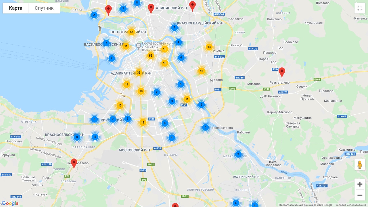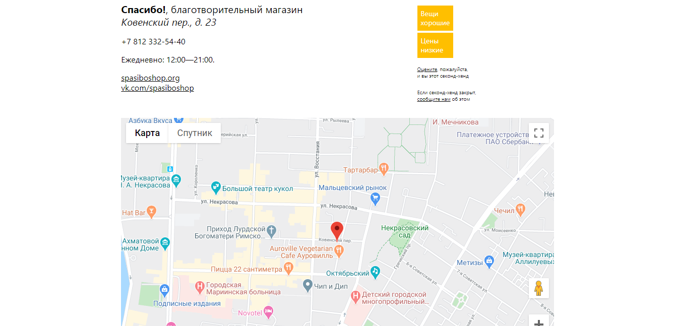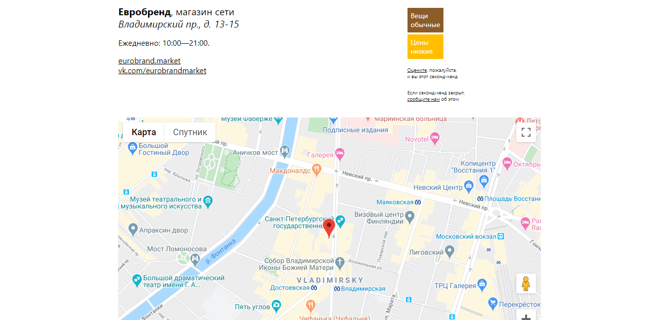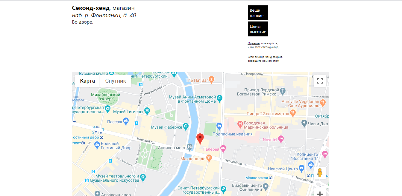 Петербуржец Женя Софронов в 2007 году создал интерактивную карту, где указаны адреса всех известных секонд-хендов. Автор насчитывает в городе 468 магазинов подержанной одежды и обуви. Каждый секонд-хенд также оценивают: на карте можно найти отметки вроде: «Вещи хорошие» и «Цены низкие».