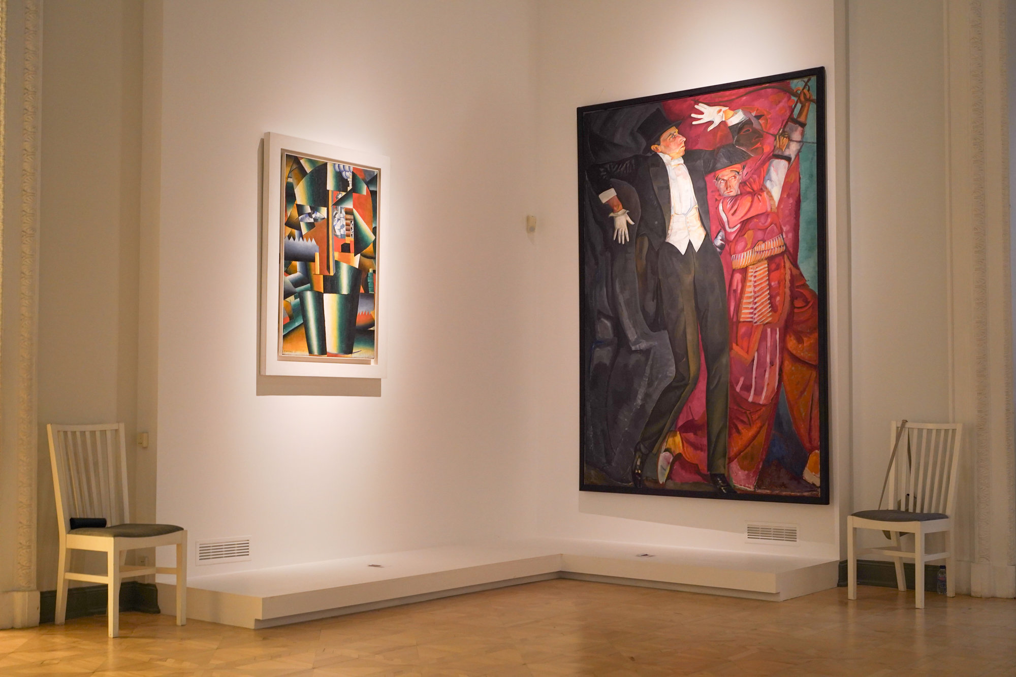 Зал Малевича посвятили постсупрематизму. Это поздний период в творчестве художника, в котором он объединил народные мотивы, иконописные традиции и супрематическую цветовую палитру. Многие из этих картин представляют собой «полуобразы» — безликие фигуры, торсы и головы. Хотя есть и полотна с более традиционными решениями: от пейзажа «Красный дом» до знаменитой «Красной конницы».