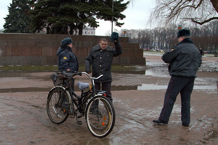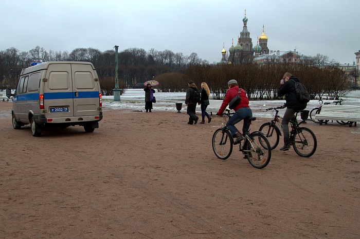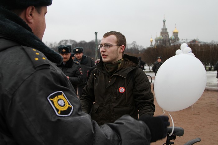 Сегодня на Марсовом поле должны были стартовать «Гражданские велопокатушки» — велопробег, организованный в преддверии митинга и марша оппозиции в субботу, 24 марта. К началу акции к участникам с разных сторон стали подходить полицейские с требованиям разойтись. Шарики с надписями «Нас надули» показались сотрудникам полиции средствами агитации. Велосипедисты стали спорить о законности требований полиции, после чего некоторых задержали.