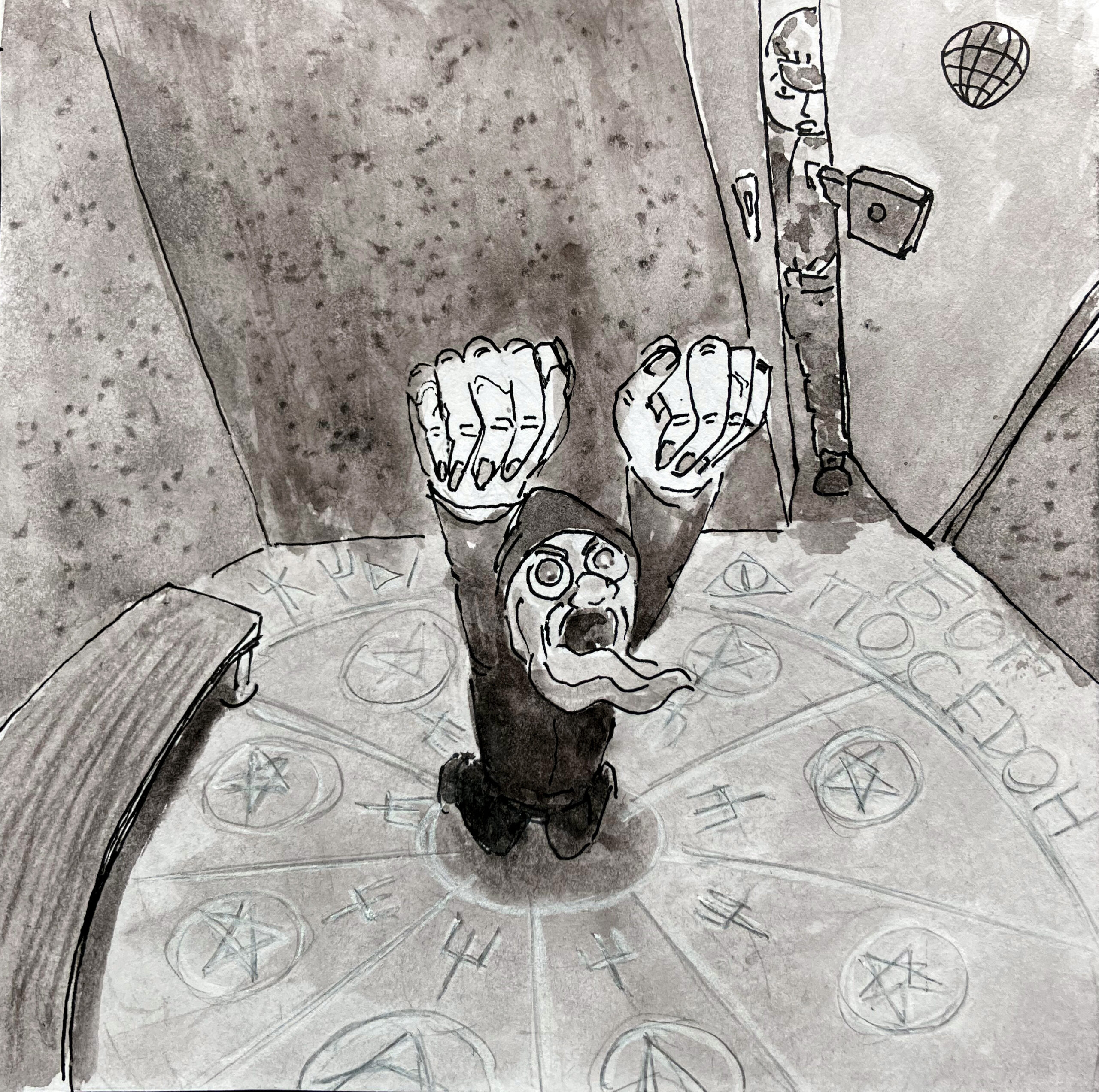Одно совершенно точно: после заселения эзотерического деда на «Арсеналку» во дворике для прогулок стали появляться руны и пентаграммы. В первый раз ощущение было, что я зашла в фильм «Вий» или «Сонная лощина». Кто-то отколупал гипсовую штукатурку со стен и нарисовал сложнейшую геометрическую композицию во весь бетонный пол. В ней был «энергетический центр» и сектора, в каждом из которых ближе к краю круга красовались небольшие пентаграммки. В углах дворика были надписи: «Руна Хазард» и «Бог Поседон» (сохранена орфография автора), а также многочисленные руны и трезубцы. Во всю скамейку, на которой вообще-то сидят, было начертано: «Я буду молить за вас шестьдесят шесть богов, ритуал на успех и богатство, оставляйте свои личные данные под скамейкой».