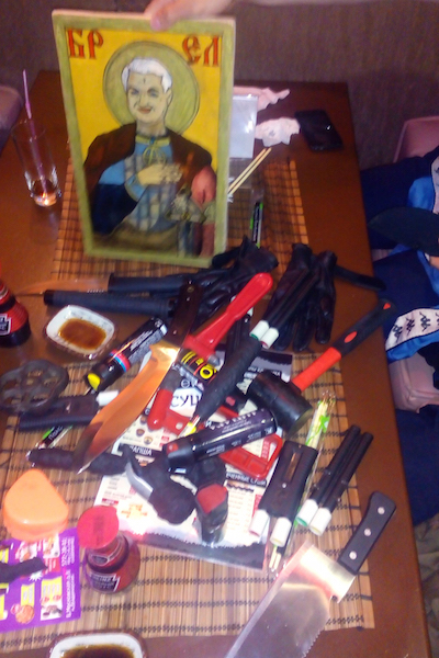 В подвальном кафе в центре Петербурга скинхед Али, Иисус, длинноволосый, мессианского вида барабанщик хардкор-группы «Комбат 26», и еще дюжина разношерстных неформалов проводят ревизию бригадного арсенала. Четыре перцовых баллончика, два красных молотка из общественного транспорта, три ножа, кастет, мачете и боксерская капа ложатся на стол к роллам и алкоголю. Венчает натюрморт нечто вроде иконы со знакомым с детства седым, морщинистым и властным образом.