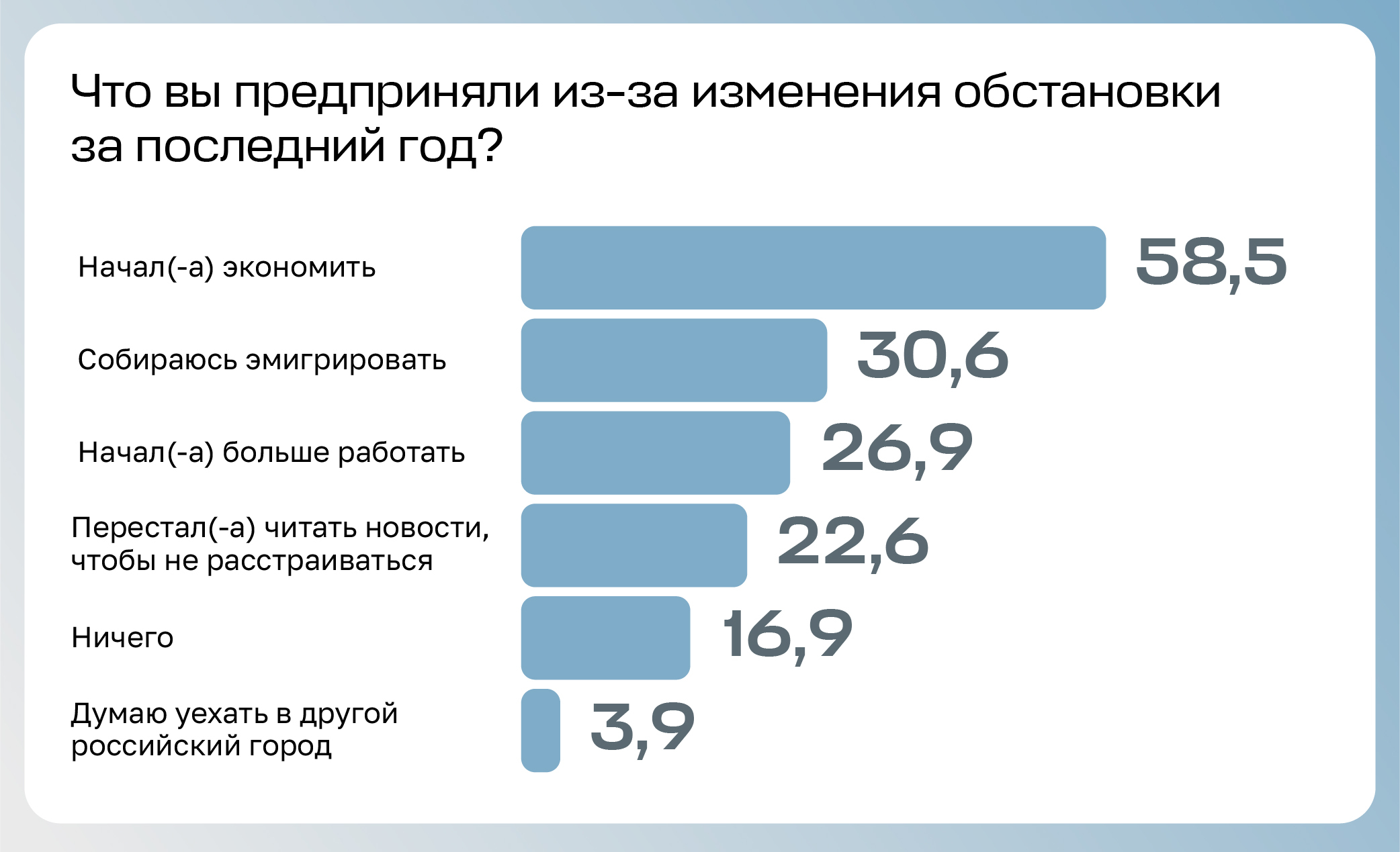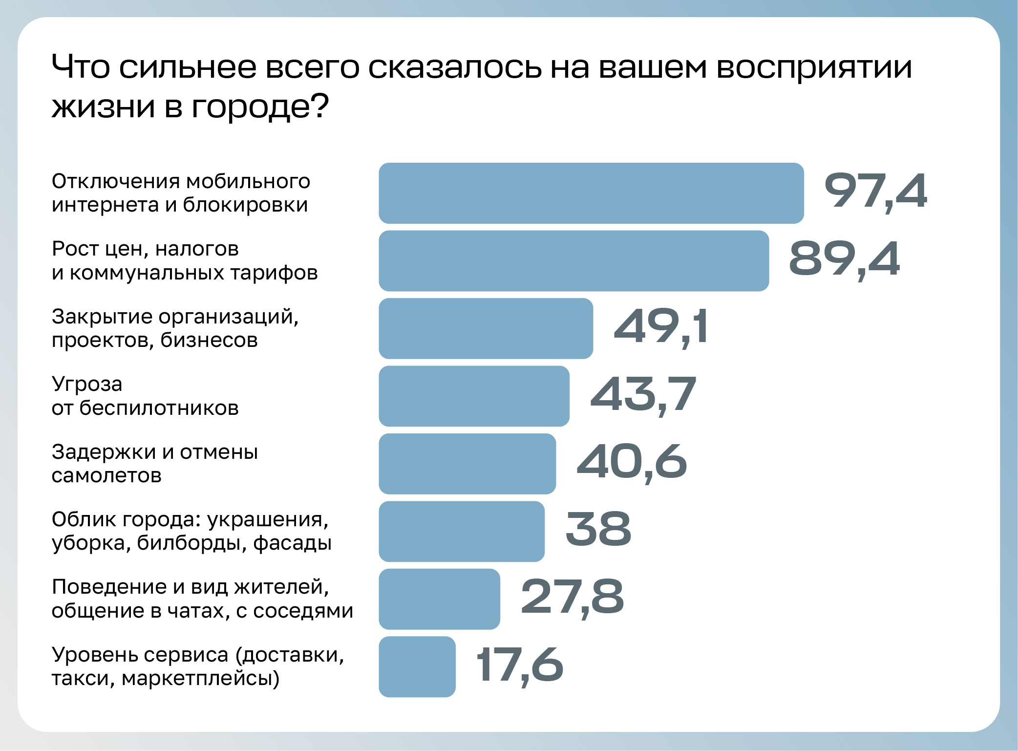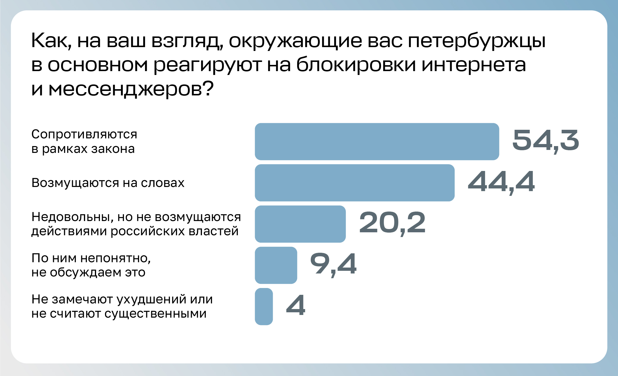 Мы спросили читателей, какую реакцию на основные изменения в городе они видят в своем окружении. 80 % отмечают возмущение ростом цен, 35 % наблюдают возмущение из-за угрозы от беспилотников и 44 % — из-за блокировок. По мнению 54 %, окружающие в основном сопротивляются блокировкам: ищут пути обхода, идут на конфликт с начальством, помогают другим с VPN.