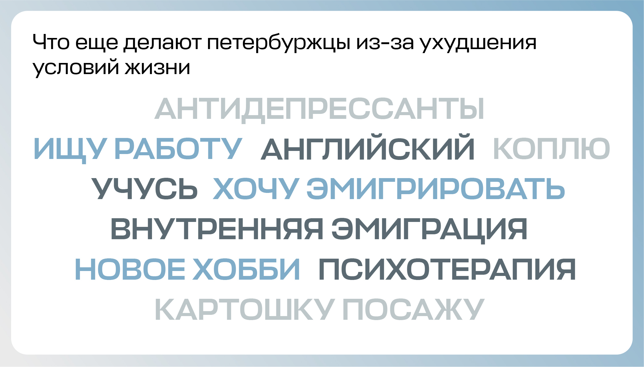 Мы видим, что наша аудитория — активные пользователи телеграма и инстаграма — психологически тяжело переживает конец 2025 — начало 2026 года. Несмотря на то, что и война, и высокая инфляция, и изоляция страны происходят уже давно, сейчас, по мнению многих читателей, у этого появился накопительный эффект. К этому добавилась угроза от беспилотников, которые чаще взрываются в Ленинградской области и приводят к жертвам.