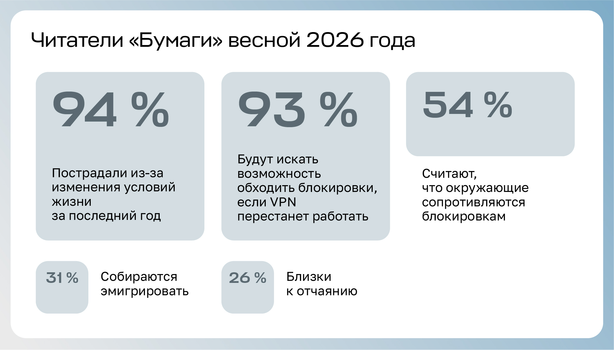 При этом люди успешно обходят блокировки мессенджеров и запрещенных сайтов, растет их техническая грамотность и готовность тратить на это ресурсы. В этих условиях кто-то выбирает эмиграцию, другие говорят о снижении планки ожиданий: оставаться «адекватным» и заботиться о близких уже многого стоит.