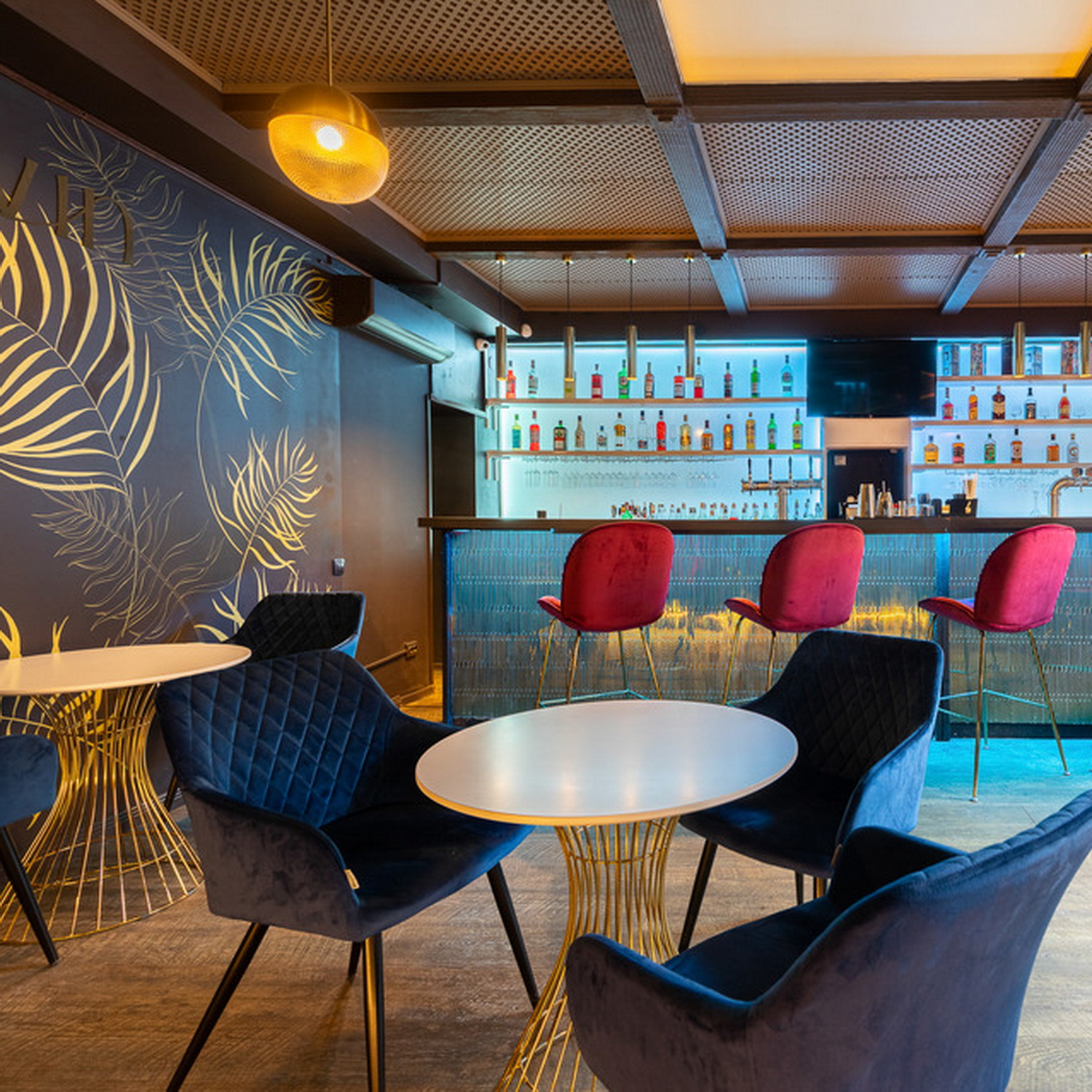 Днем заведение на Коломенской улице работает в формате бистро, а по вечерам превращается в коктейльный бар. Помещение оформили в зеленых и золотых цветах — часть стен вручную расписали золотыми пальмовыми ветвями. Вино и коктейли в баре наливают из кранов — такой способ предполагает быструю подачу. Кроме того, заказать можно классические коктейли и еду: например, шесть хот-догов, салаты и антипасти — острые баклажаны с кинзой, тарелку локальных сыров и другие позиции.