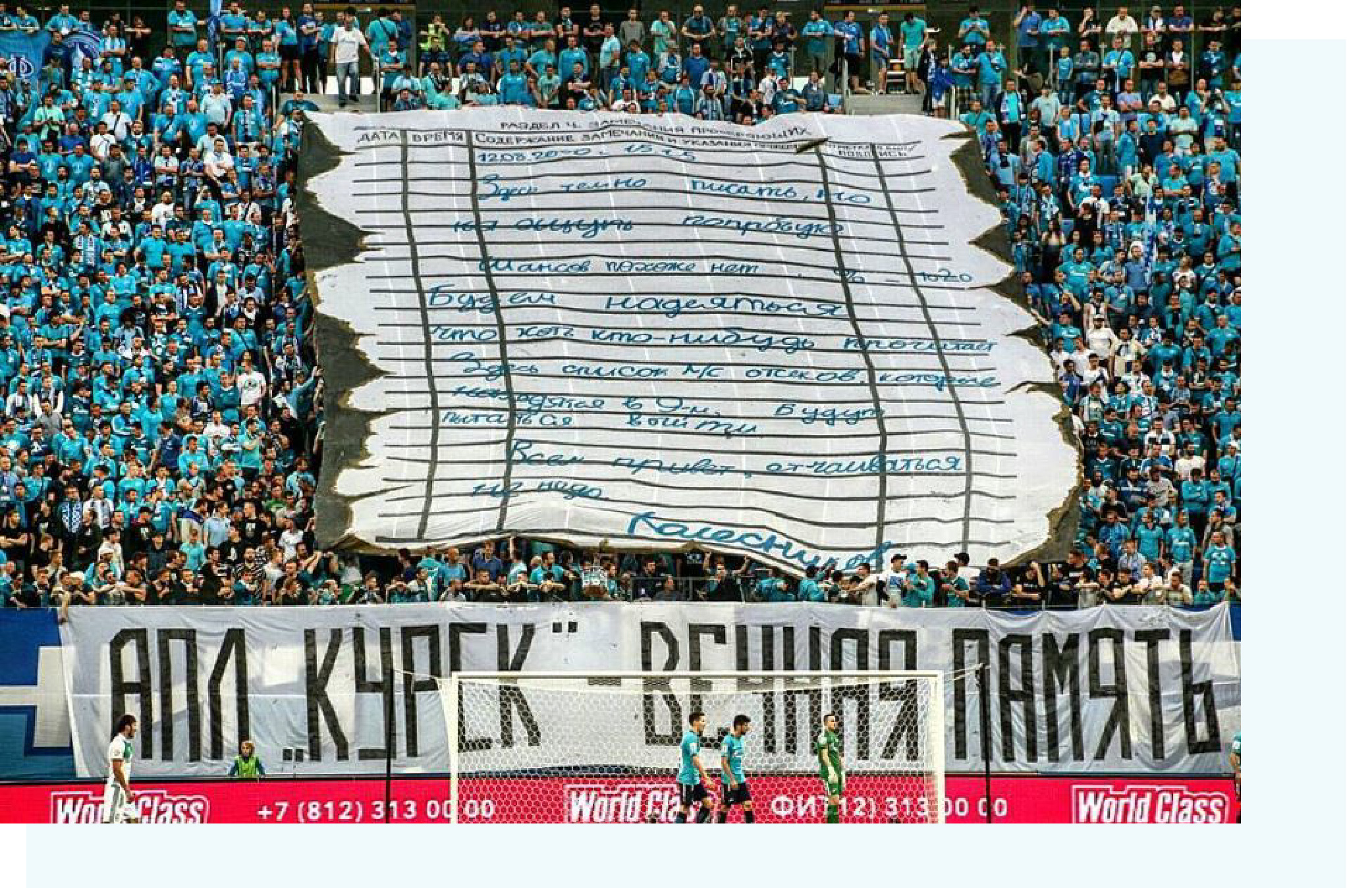 Другая акция сезона 2017/2018 — памяти погибших моряков «Курска» на августовском матче с «Ахматом». Баннер выполнили в виде письма командира подлодки Дмитрия Колесникова, которое тот написал перед смертью. В письме Колесникова, текст которого болельщики перенесли на баннер, сказано: «15:45. Здесь темно писать, но на ощупь попробую… Шансов, похоже, нет. Процентов 10–20. Будем надеяться, что хоть кто-нибудь прочитает. Здесь списки личного состава отсеков, некоторые находятся в девятом и будут пытаться выйти. Всем привет, отчаиваться не надо». Фанаты почтили память погибших моряков минутой молчания и исполнили песню «Там за туманами» группы «Любэ».