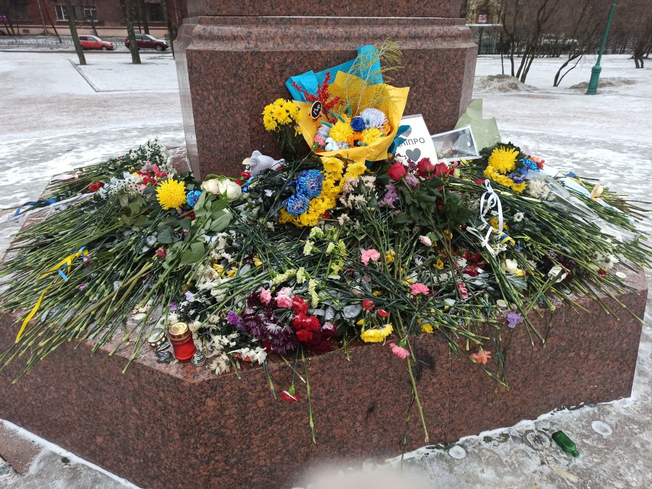 Стихийный мемориал у памятника Тарасу Шевченко в Петербурге в память о погибших мирных украинцах в Днепре. Фото: читатели «Бумаги»