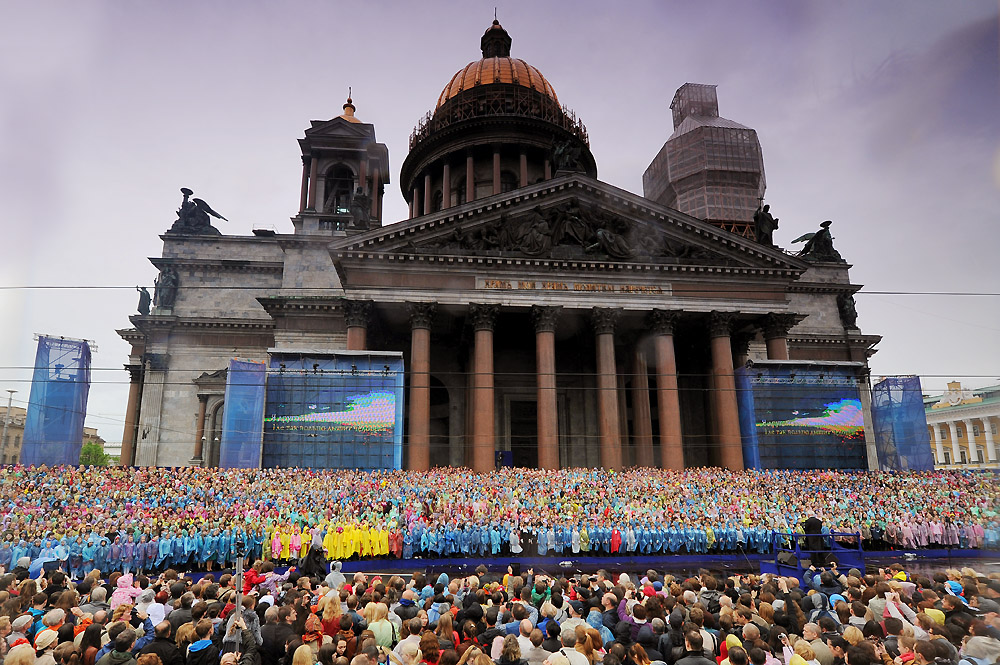 В воскресенье на ступенях Исаакиевского собора в сопровождении большого симфонического оркестра выступил хор 4335 человек — студенты, школьники, пенсионеры и профессиональные певцы спели 14 песен, поздравив Петербург с 310 днем рождения. Так петербургской академической капеллой была сделана попытка попасть в книгу рекордов Гиннеса. Когда во время выступления начал моросить пошел дождь, певцам пришлось укрыться под дождевиками и зонтиками.