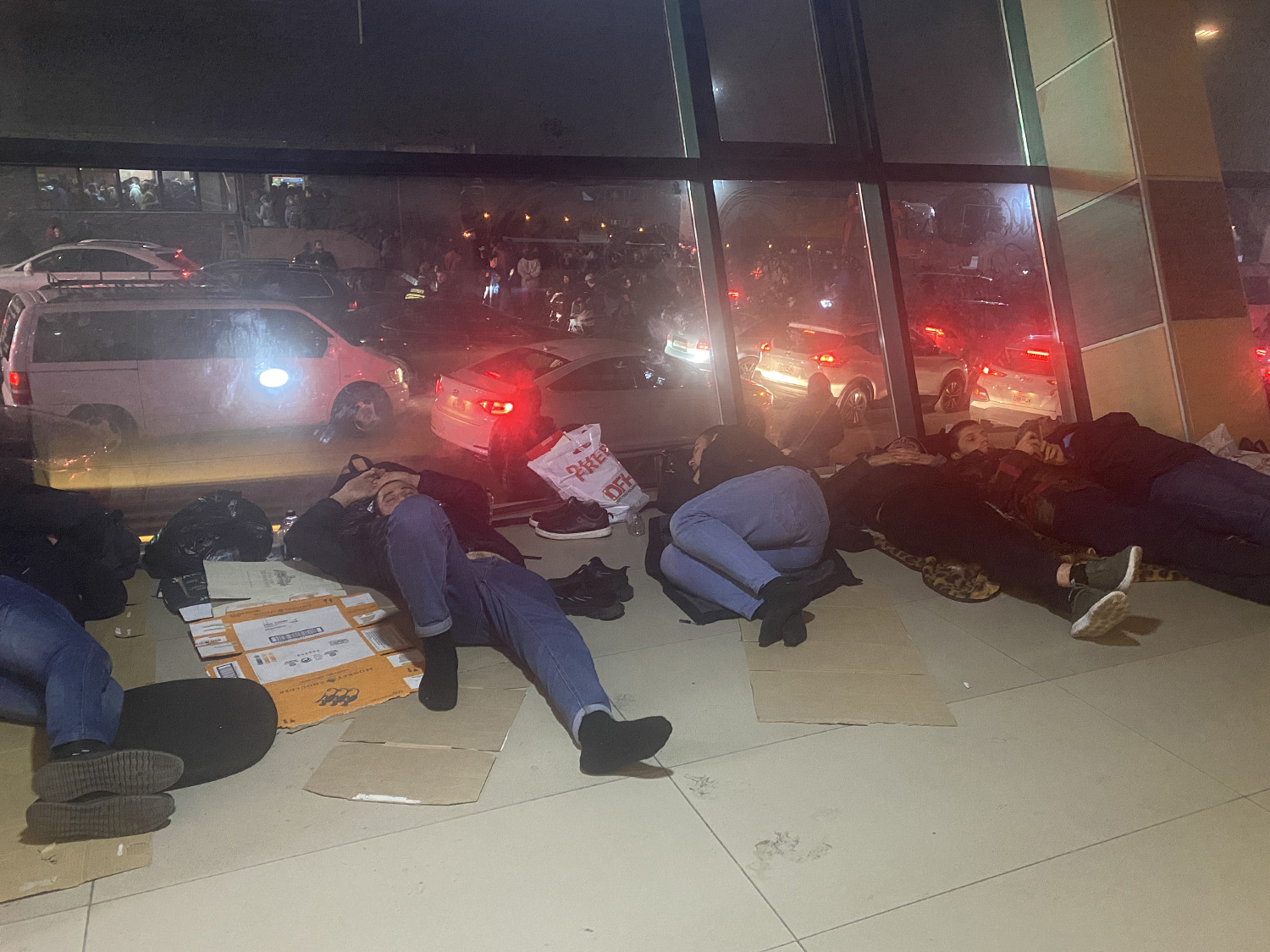 — Сначала, когда мы зашли, подумали: какой трешак, это что вообще? А потом от безвыходности просто кладешь эту картонку на пол — полы еще отапливаемые. В общем, лежишь, греешься, — рассказывает молодая девушка из Дагестана. Она на «нейтралке» уже 10 часов. — Огромный минус, что здесь не купить воду, еду. Есть дьюти-фри, но там алкоголь и всё за 10 млн рублей продается. Каждый, кто что-то взял с собой, делится.