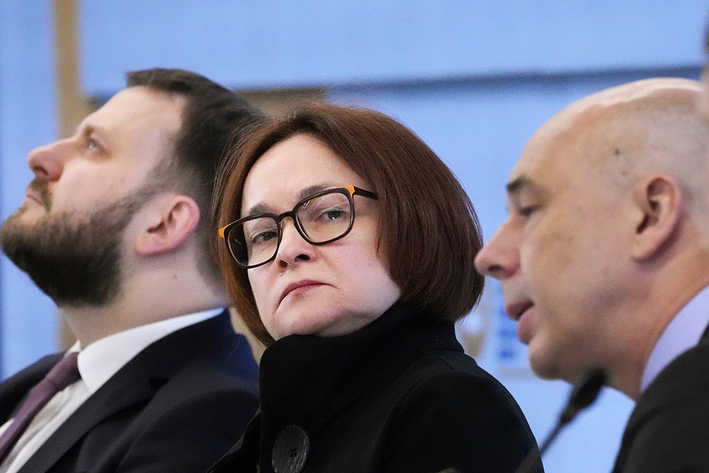 Слева направо: помощник президента РФ Максим Орешкин, председатель Центрального банка Российской Федерации Эльвира Набиуллина и министр финансов РФ Антон Силуанов. Фото: Дмитрий Ловецкий, AP Photo