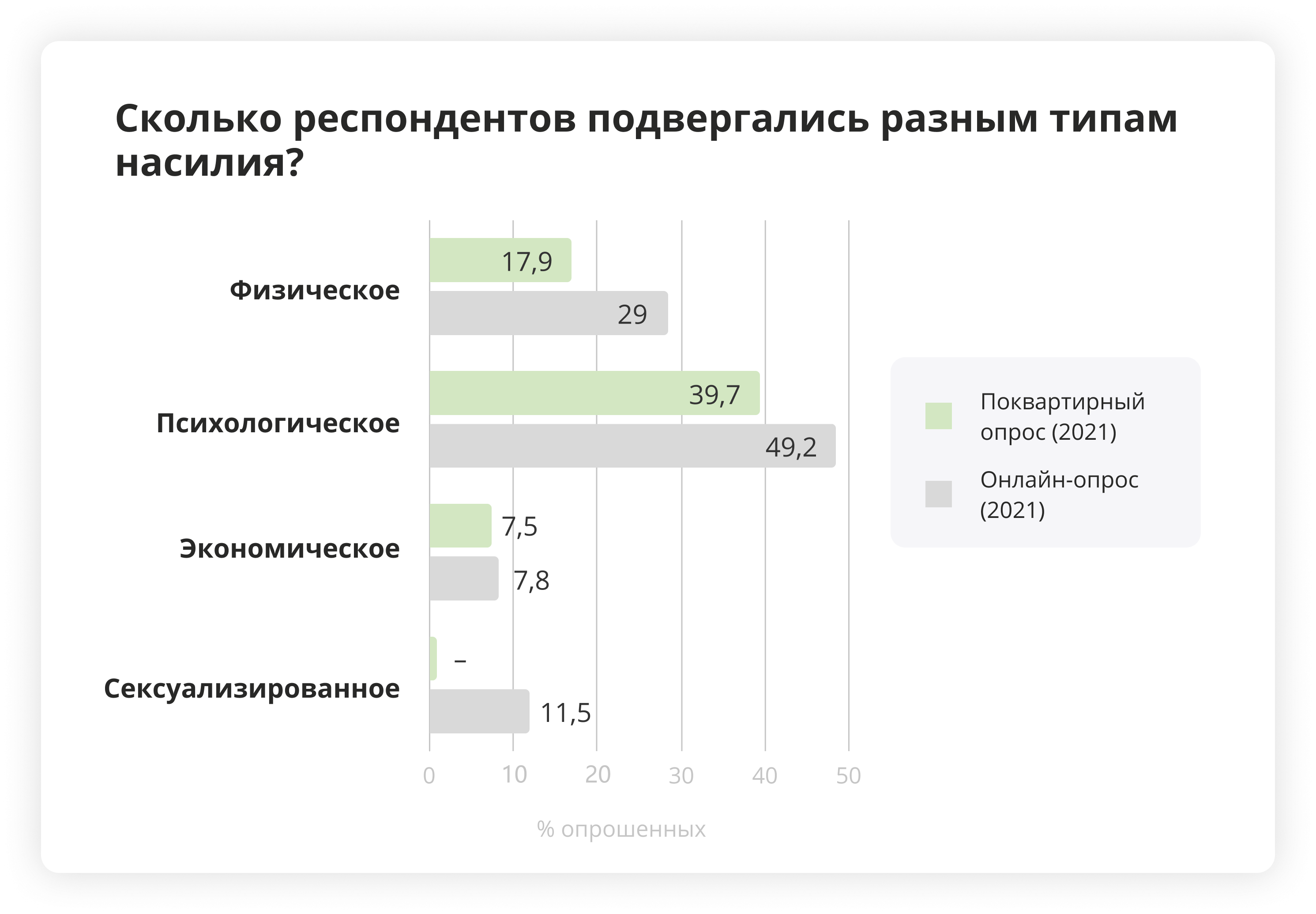 Для физического, психологического и экономического насилия мы приводим две оценки: по результатам поквартирного опроса и онлайн-данным. Первая оценка занижена из-за специфики метода. Вторая, наоборот, показывает верхнюю границу. Вместе они отражают картину наиболее корректно.