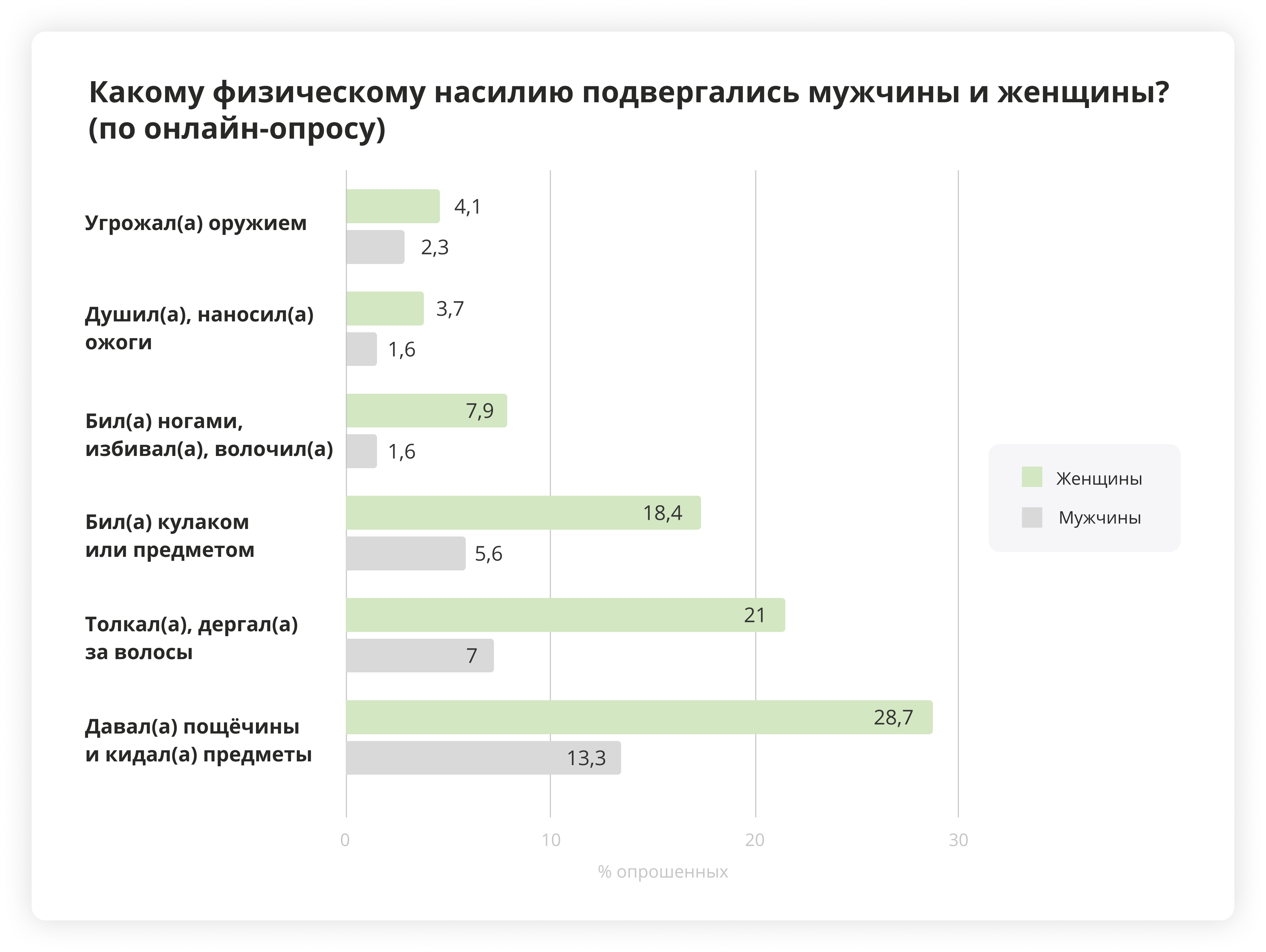 Экономическое насилие — это случаи, когда человек лишает партнера финансовых ресурсов. О нем и в офлайн-, и в онлайн-опросе рассказали около 8 %.