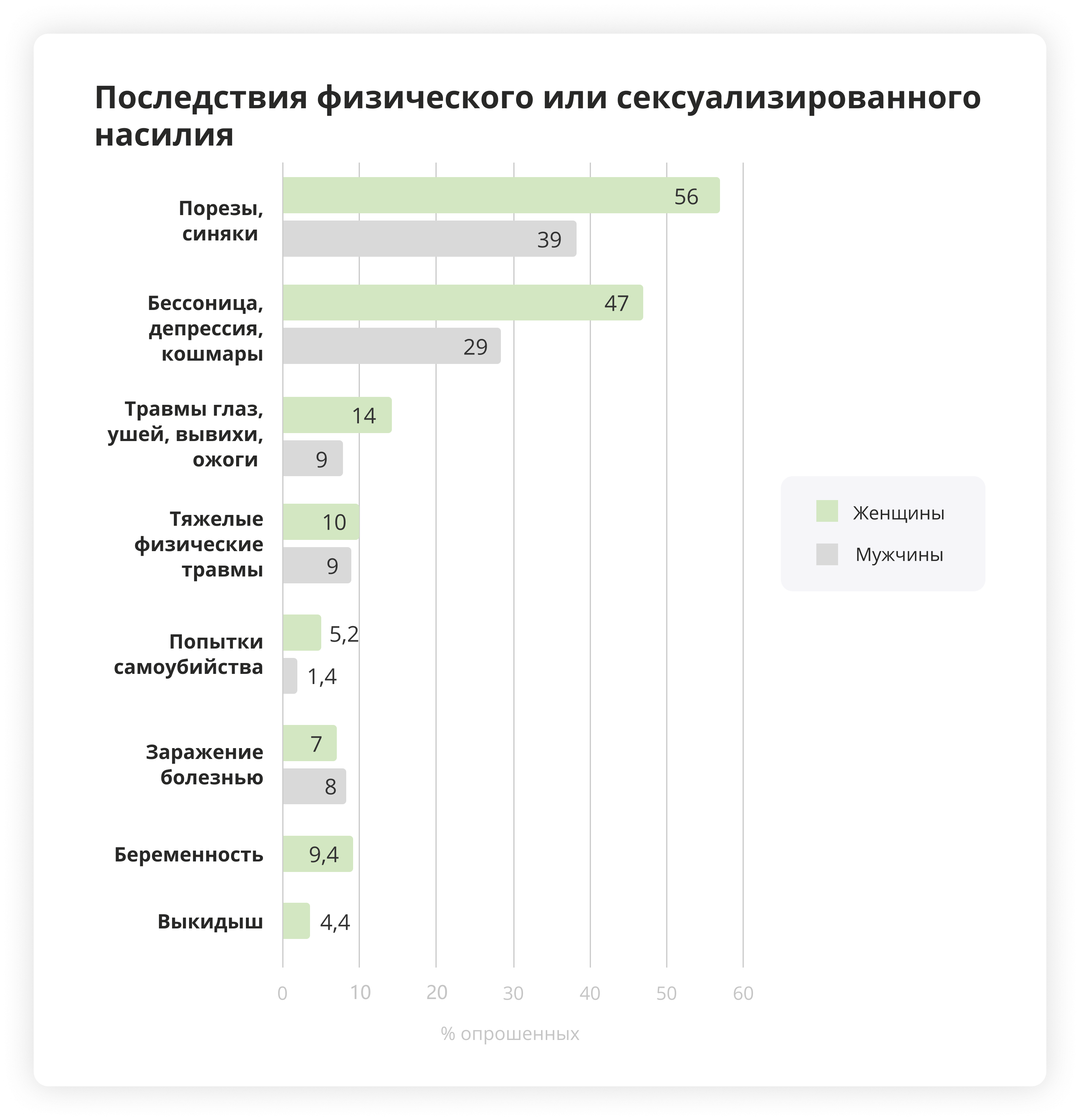 Тяжелые травмы — глубокие раны, переломы, сломанные зубы, травмы внутренних органов — остались примерно у 9–10% женщин и мужчин. А 7–8 % рассказали о заражении заболеванием в результате пережитого насилия.