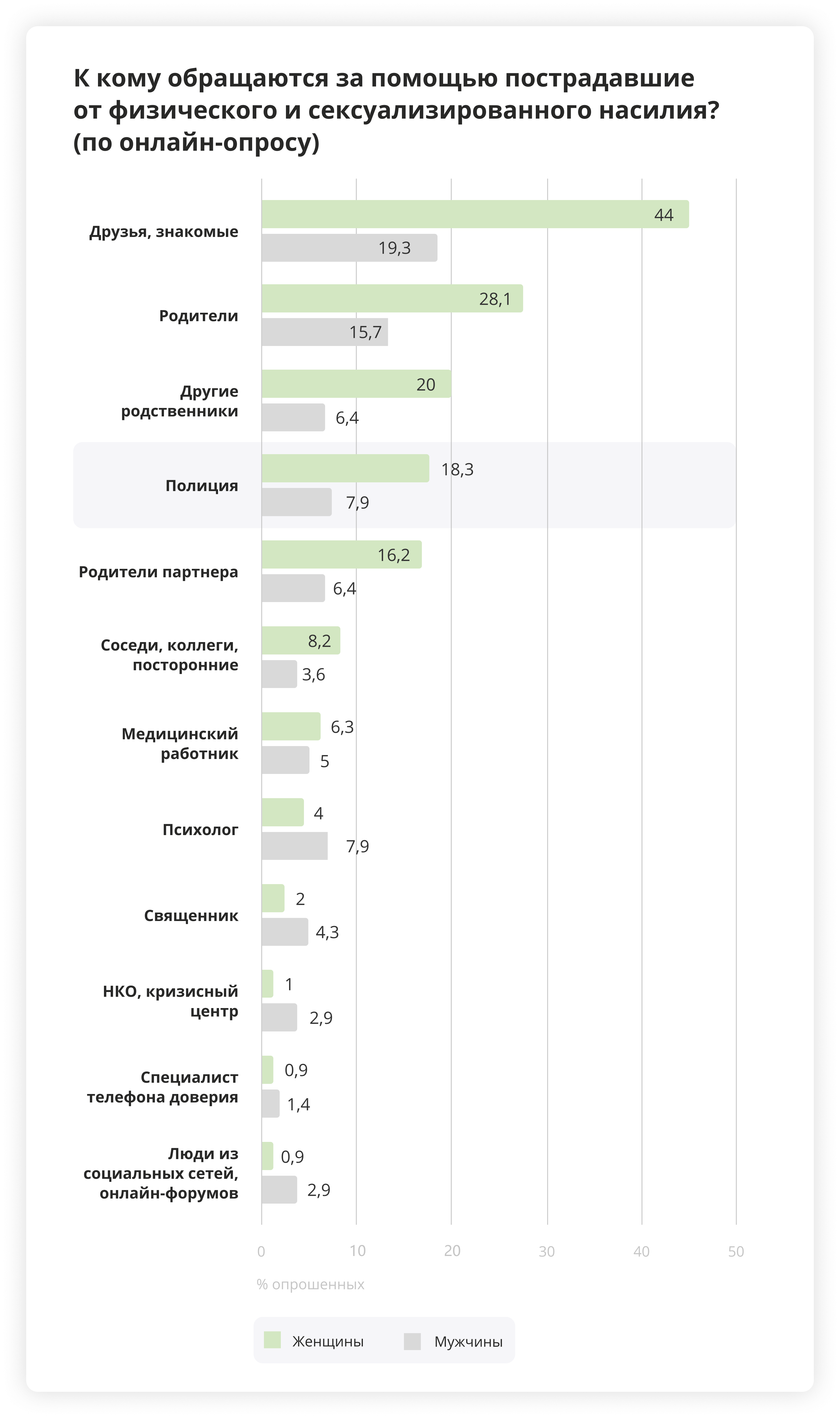 Вместо государственных и общественных организаций люди ищут помощи в своем социальном кругу. 44 % женщин и 19 % мужчин, когда-либо столкнувшихся с насилием, рассказали, что обращались к друзьям, 28 % женщин и 15 % мужчин пошли за помощью к своим родителям. К родителям партнера обращались 16 % женщин и 6 % мужчин.