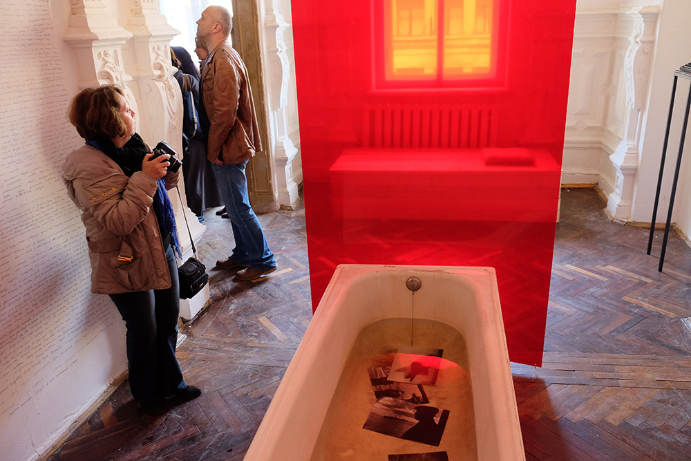 «Прямо в ванной плавают проявляющиеся фотографии. Отец Бродского был профессиональным фотографом, и там располагалось его лаборатория. Этот красный светофильтр будет также символизировать травлю, судилище над поэтом, которое проходило в стране».