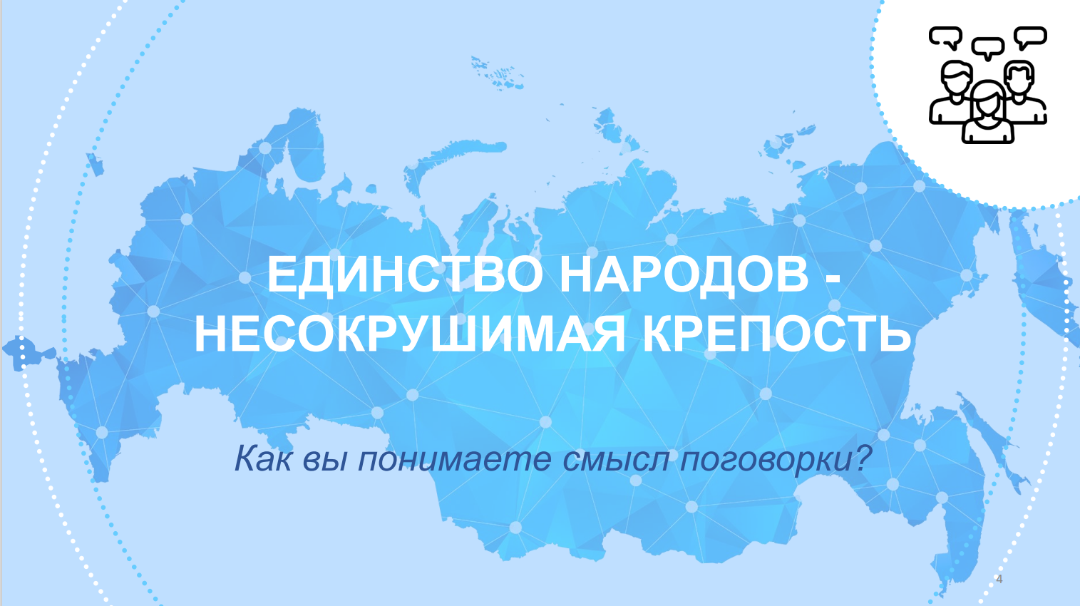 Сперва ученикам предлагают подумать о смысле поговорки «Единство народов — несокрушимая крепость». Сборники пословиц обозначают, что эта поговорка — чеченская.