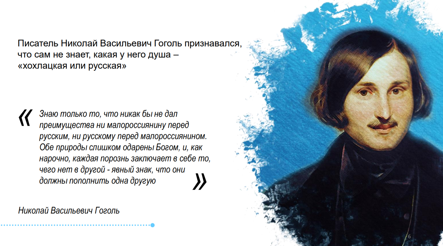 Дальше в презентации утверждается: Украина и Россия — две части единого исторического, духовного и культурного пространства. В подтверждение этому приведена цитата писателя Николая Гоголя.