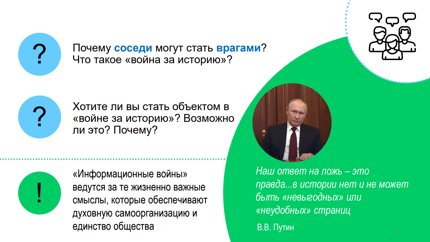 После этого ученикам предлагается ответить на несколько вопросов — в том числе о том, хотят ли они «стать объектом в „войне за историю“».