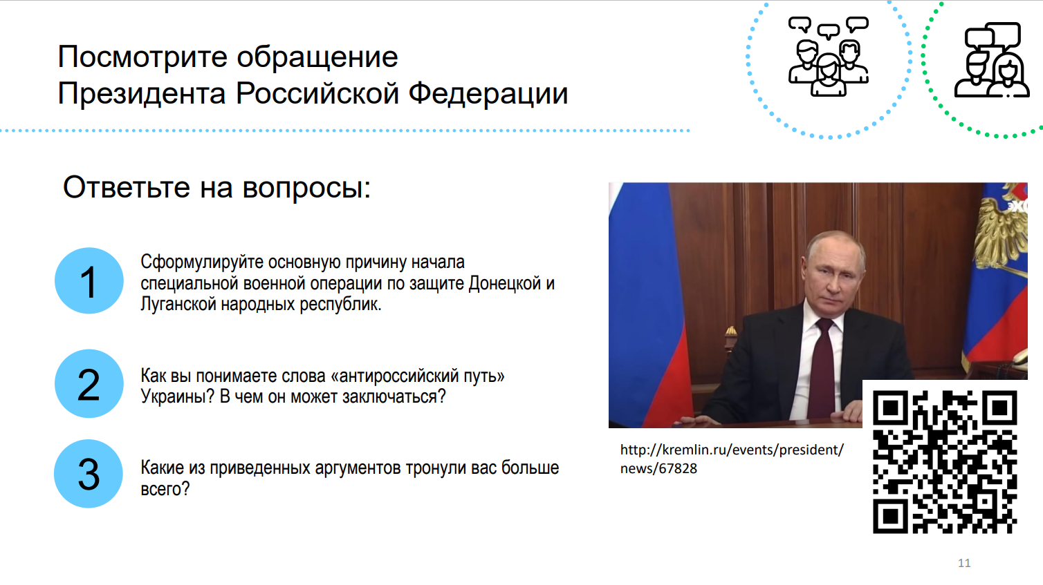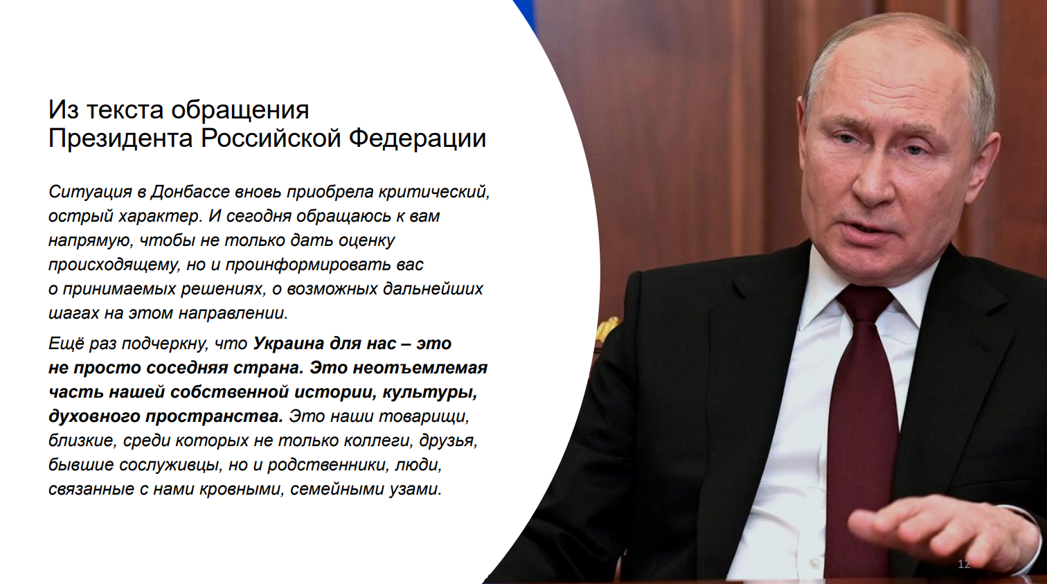 Учителя получают от руководства школ пособия с текстом, схожим по смыслу с речью Владимира Путина о признании ДНР и ЛНР. Одной из собеседниц «Бумаги» также выдали презентации: для учеников 6–8 и 9–11 классов.